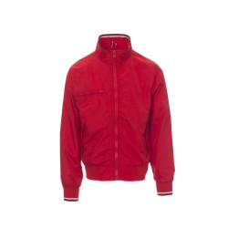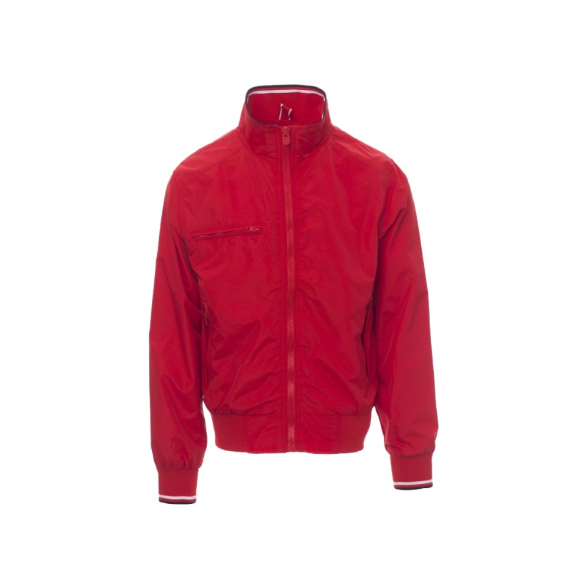 Blouson homme, zip de 8 mm en plastique avec curseur en métal, col, poignets et taille en bord-côte élastique à rayures, deux poches extérieures avec zip en plastique. Intérieur : non rembourré, à filet, une poche zippée pour smartphone avec passage pour câble, zip sur la poitrine et le dos pour faciliter les impressions et broderies.