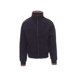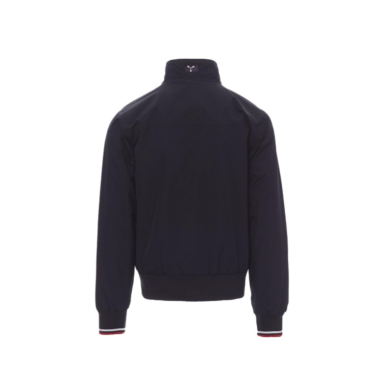 Blouson homme, zip de 8 mm en plastique avec curseur en métal, col, poignets et taille en bord-côte élastique à rayures, deux poches extérieures avec zip en plastique. Intérieur : non rembourré, à filet, une poche zippée pour smartphone avec passage pour câble, zip sur la poitrine et le dos pour faciliter les impressions et broderies.