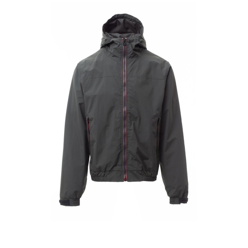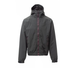 Blouson homme, zip de 8 mm en contraste, capuche profilée à deux coutures et coulisse, élastique à la taille, poignets avec élastique et serre-poignets caoutchouc de réglage, deux poches extérieures avec zip couvert. Intérieur : non rembourré, à filet, une poche zippée pour smartphone avec passage pour câble, zip sur la poitrine et le dos pour faciliter les impressions et broderies.
