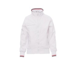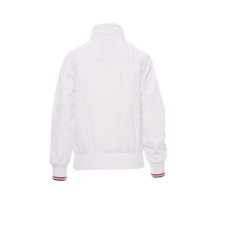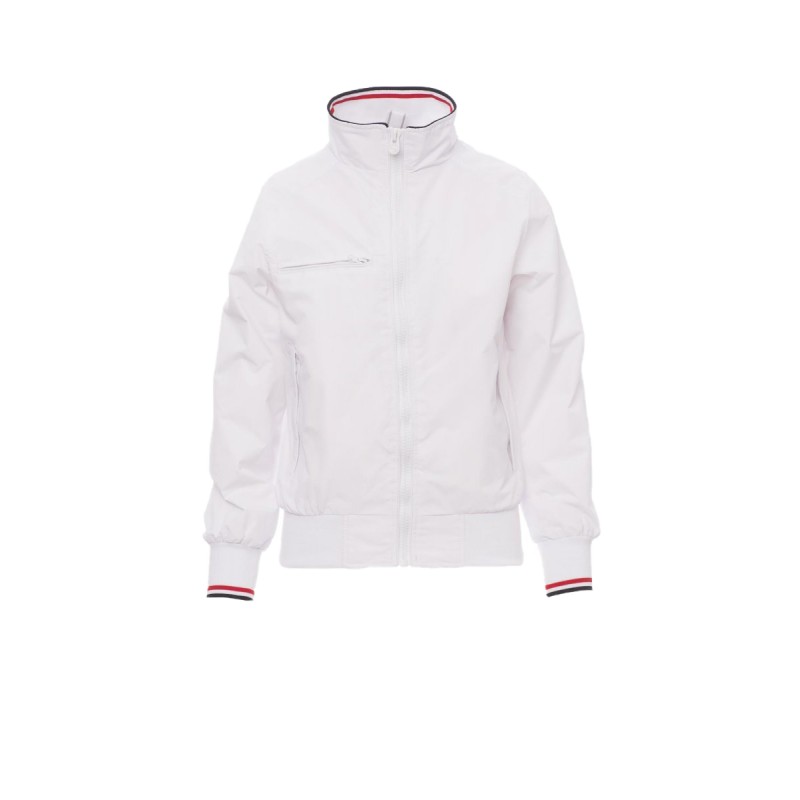 Blouson femme coupe ergonomique, zip de 8 mm en plastique avec curseur en métal, col, poignets et taille en bord-côte élastique à rayures, deux poches extérieures avec zip en plastique. Intérieur : non rembourré, à filet, une poche zippée pour smartphone avec passage pour câble, zip sur la poitrine et le dos pour faciliter les impressions et broderies.