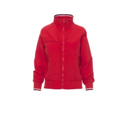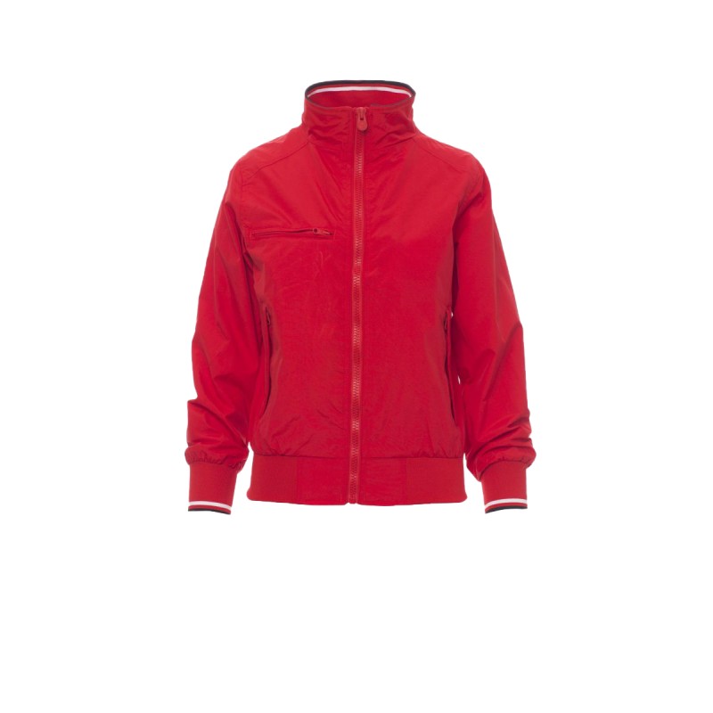 Blouson femme coupe ergonomique, zip de 8 mm en plastique avec curseur en métal, col, poignets et taille en bord-côte élastique à rayures, deux poches extérieures avec zip en plastique. Intérieur : non rembourré, à filet, une poche zippée pour smartphone avec passage pour câble, zip sur la poitrine et le dos pour faciliter les impressions et broderies.