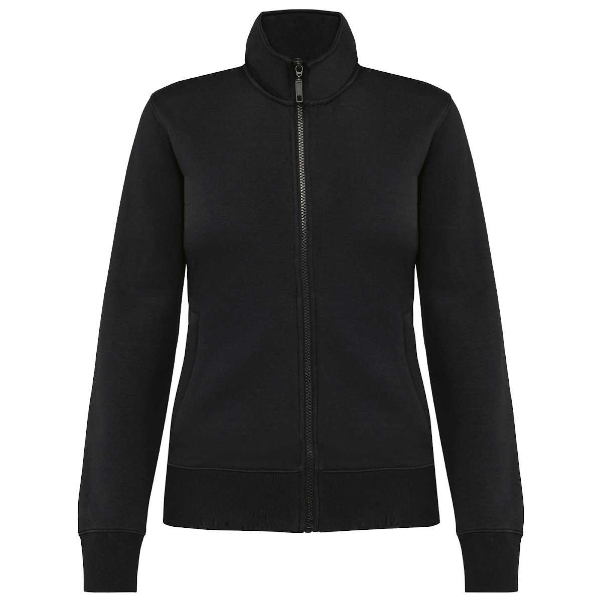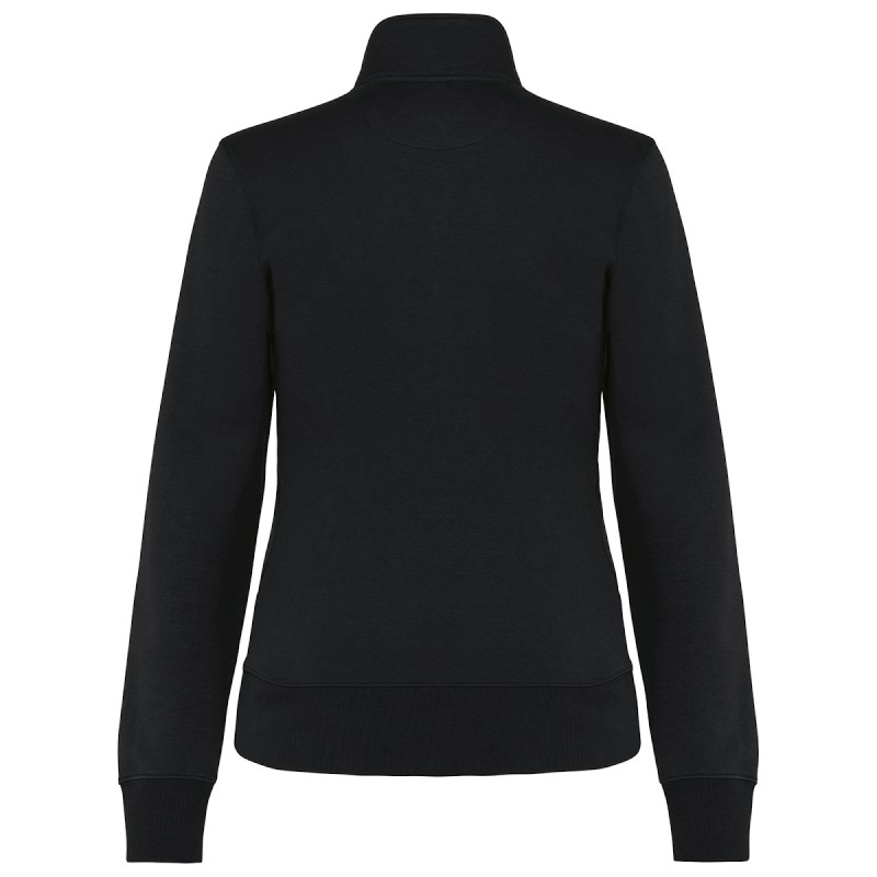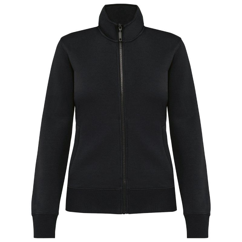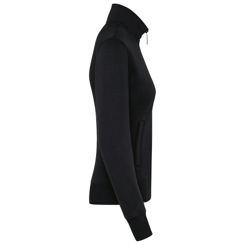 80% coton / 20% polyester. Surface extérieure 100% coton. Traitement LSF (Low Shrinkage Fleece : molleton prérétréci). Molleton gratté 3 fils en coton peigné. Coupe ajustée. Manches droites. Col montant. Fermeture zippée plastique ton sur ton. 2 poches zippées et passepoilées côté. Finition demi-lune à l'encolure dos pour faciliter la personnalisation de marque à l'intérieur col. Finition bord-côte 1x1 bas de manches et de vêtement. Etiquette de marque Tear Away.