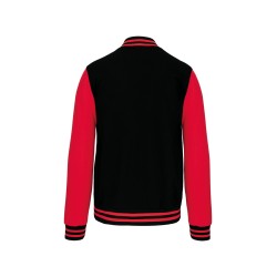 70% coton / 30% polyester. Molleton gratté 3 fils. Manches montées contrastées. Fermeture devant par boutons pression contrastés. Bord-côte avec 2 liserés contrastés au col, manches et bas de vêtement. 2 poches passepoilées contrastées devant. Bande de propreté en chevron et boucle d'accrochage à l'intérieur col. Pas d'étiquette de marque au col, uniquement une puce de taille pour faciliter la personnalisation.