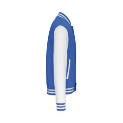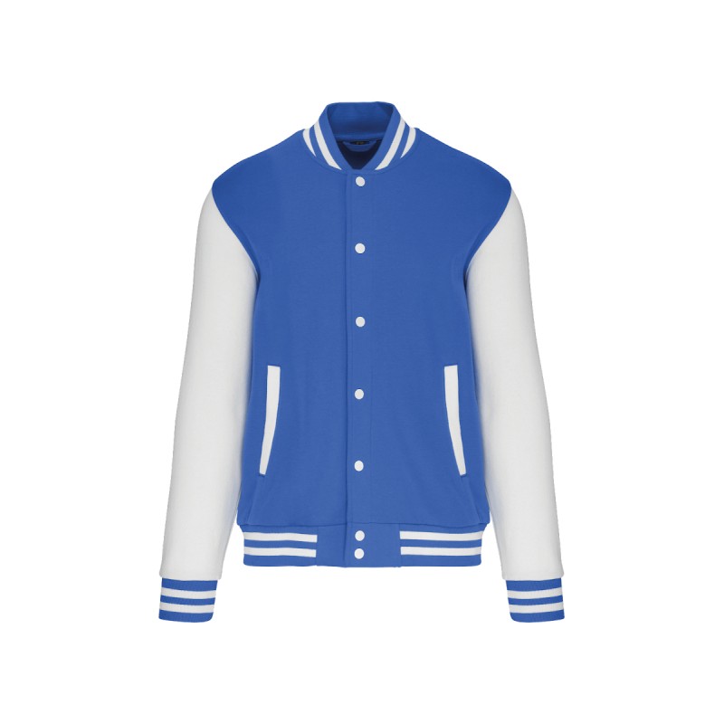 70% coton / 30% polyester. Molleton gratté 3 fils. Manches montées contrastées. Fermeture devant par boutons pression contrastés. Bord-côte avec 2 liserés contrastés au col, manches et bas de vêtement. 2 poches passepoilées contrastées devant. Bande de propreté en chevron et boucle d'accrochage à l'intérieur col. Pas d'étiquette de marque au col, uniquement une puce de taille pour faciliter la personnalisation.