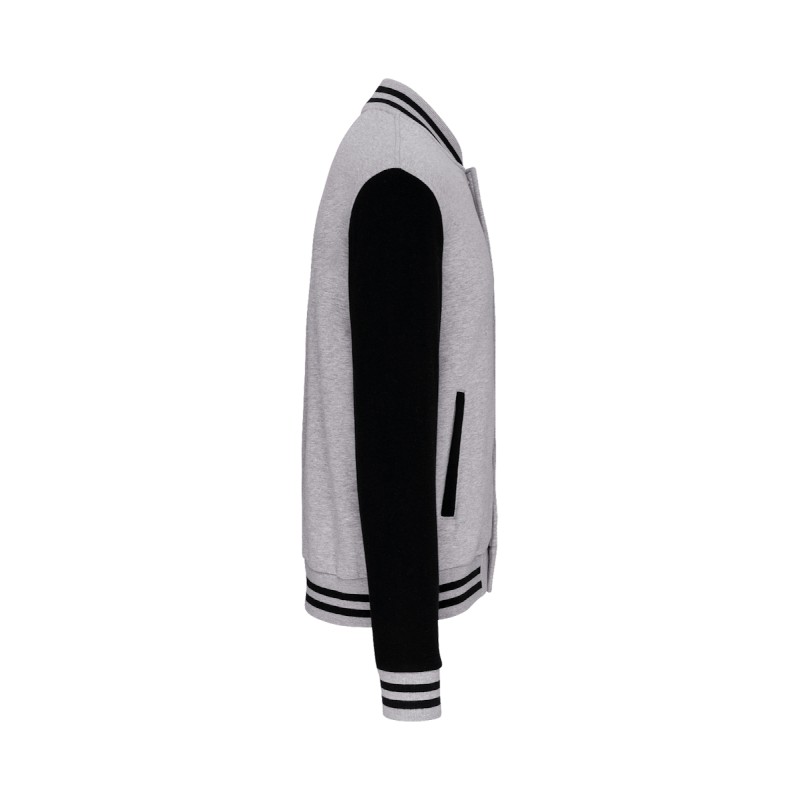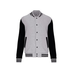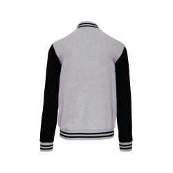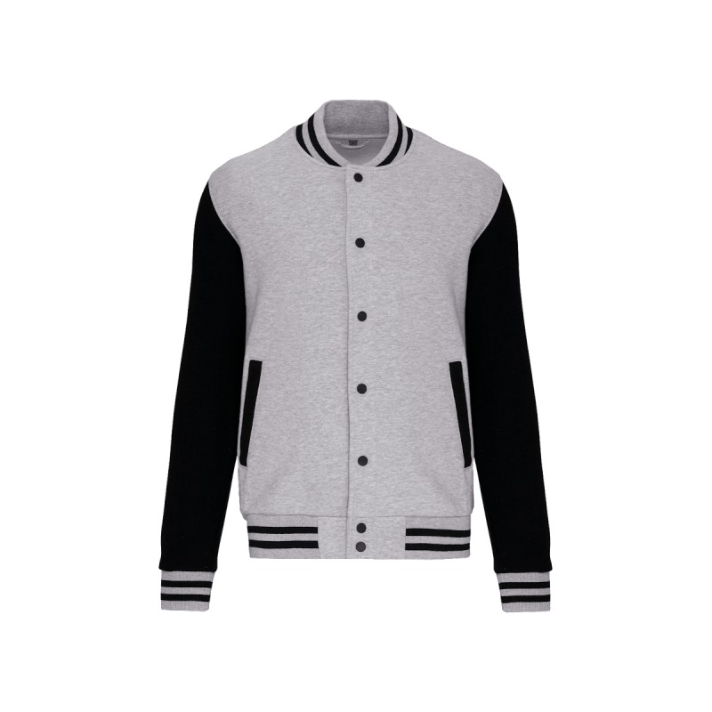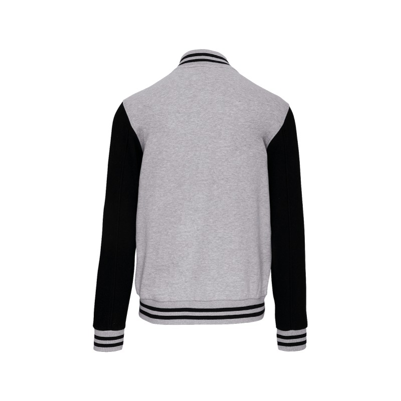 70% coton / 30% polyester. Molleton gratté 3 fils. Manches montées contrastées. Fermeture devant par boutons pression contrastés. Bord-côte avec 2 liserés contrastés au col, manches et bas de vêtement. 2 poches passepoilées contrastées devant. Bande de propreté en chevron et boucle d'accrochage à l'intérieur col. Pas d'étiquette de marque au col, uniquement une puce de taille pour faciliter la personnalisation.