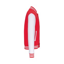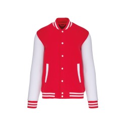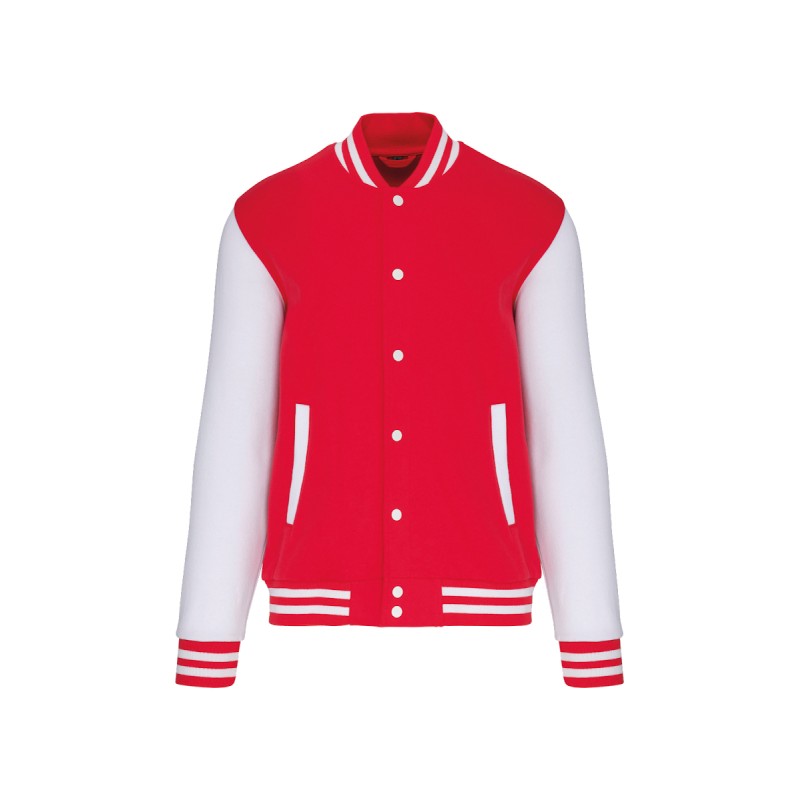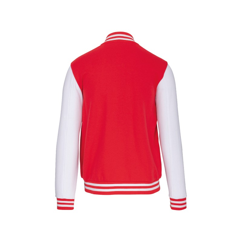 70% coton / 30% polyester. Molleton gratté 3 fils. Manches montées contrastées. Fermeture devant par boutons pression contrastés. Bord-côte avec 2 liserés contrastés au col, manches et bas de vêtement. 2 poches passepoilées contrastées devant. Bande de propreté en chevron et boucle d'accrochage à l'intérieur col. Pas d'étiquette de marque au col, uniquement une puce de taille pour faciliter la personnalisation.