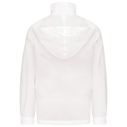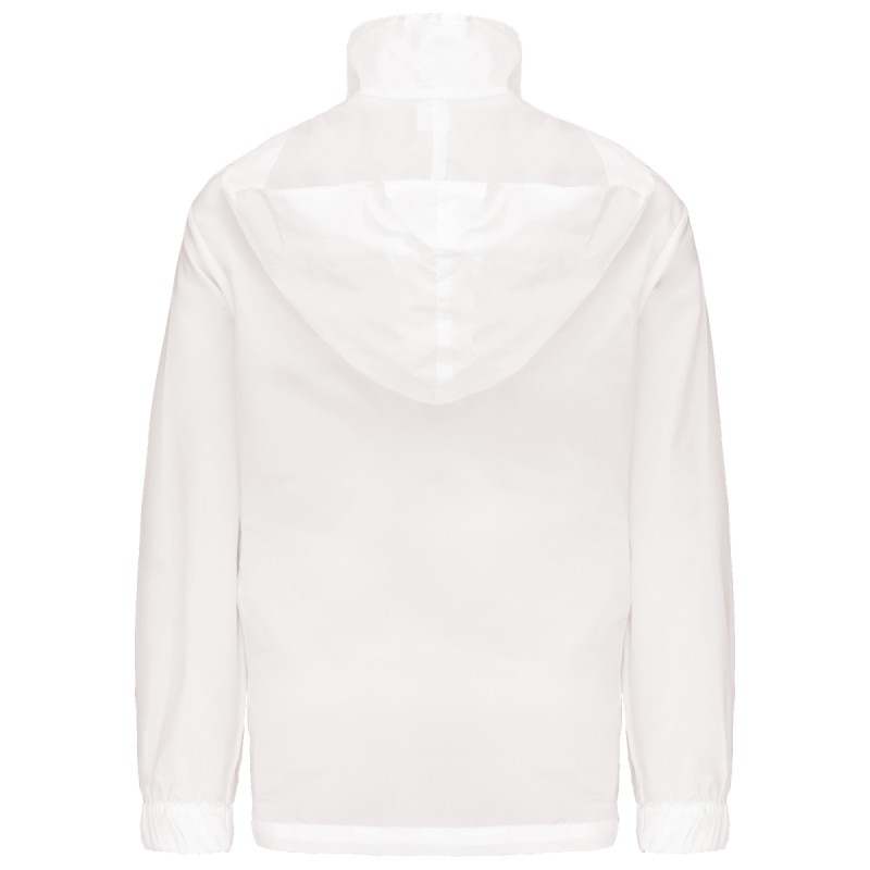 100% polyester. Fermeture zippée ton sur ton. Capuche dans le col avec patte auto-agrippante. 2 poches zippées devant. Bas de manches élastiqué. Repliable dans sa poche sur la base du système K-Way®.