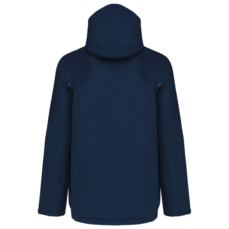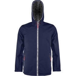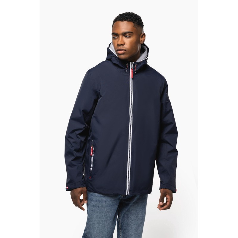 100% polyamide. Respirante 5000 g/m²/24h. Imperméable 3000 mm. Coutures thermosoudées étanches. Fermeture zippée. 2 poches zippées devant. 1 poche intérieure. Doublure polyester contrastée. Capuche doublée filet et réglable. Zip de personnalisation bas et poitrine.