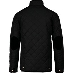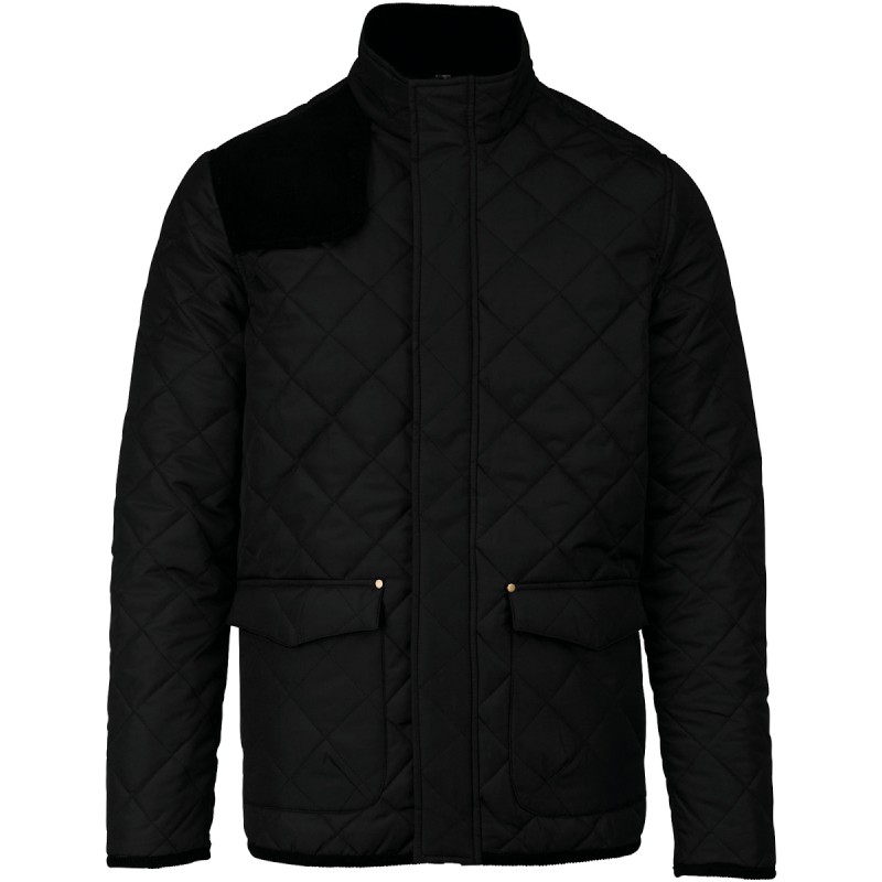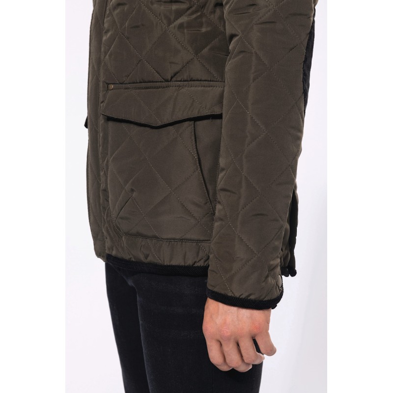 Extérieur : 100% polyester pongé. Intérieur : 100% polyester taffetas. Fermeture zippée cachée par patte pressionnée. 2 double poches devant avec rabat pressionné. 1 poche intérieure. Empiècement pressionné sur l'épaule. Finitions bas de manches et de vêtement, coudières, intérieur col et dessous du rabat de poche en velours côtelé. 2 fentes d'aisance pressionnées au bas du dos. Boutons pression au poignet.