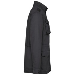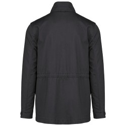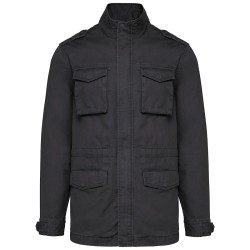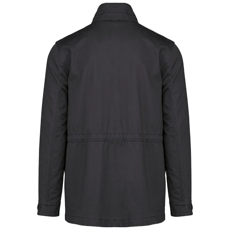 100% coton. Construction twill. Coupe droite. Vêtement lavé. Cette technique peut présenter des variations de couleurs d'un produit à un autre et rend chaque pièce unique. Fermeture zippée avec curseur en métal et tirette en tissu principal ainsi qu'une patte de boutonnage avec boutons pression invisibles milieu devant. Finition intérieure avec parmenture. Quatre poches extérieures avec bouton pression. Poignet avec patte décorative maintenu avec un bouton pression. Cordon de serrage ajustable à la taille avec stopper effet cuir à l'intérieur du vêtement. Patte épaule avec bouton. Poche intérieure avec velcro. Demi lune intérieure pour faciliter la personnalisation avec bride de suspension intérieure.
