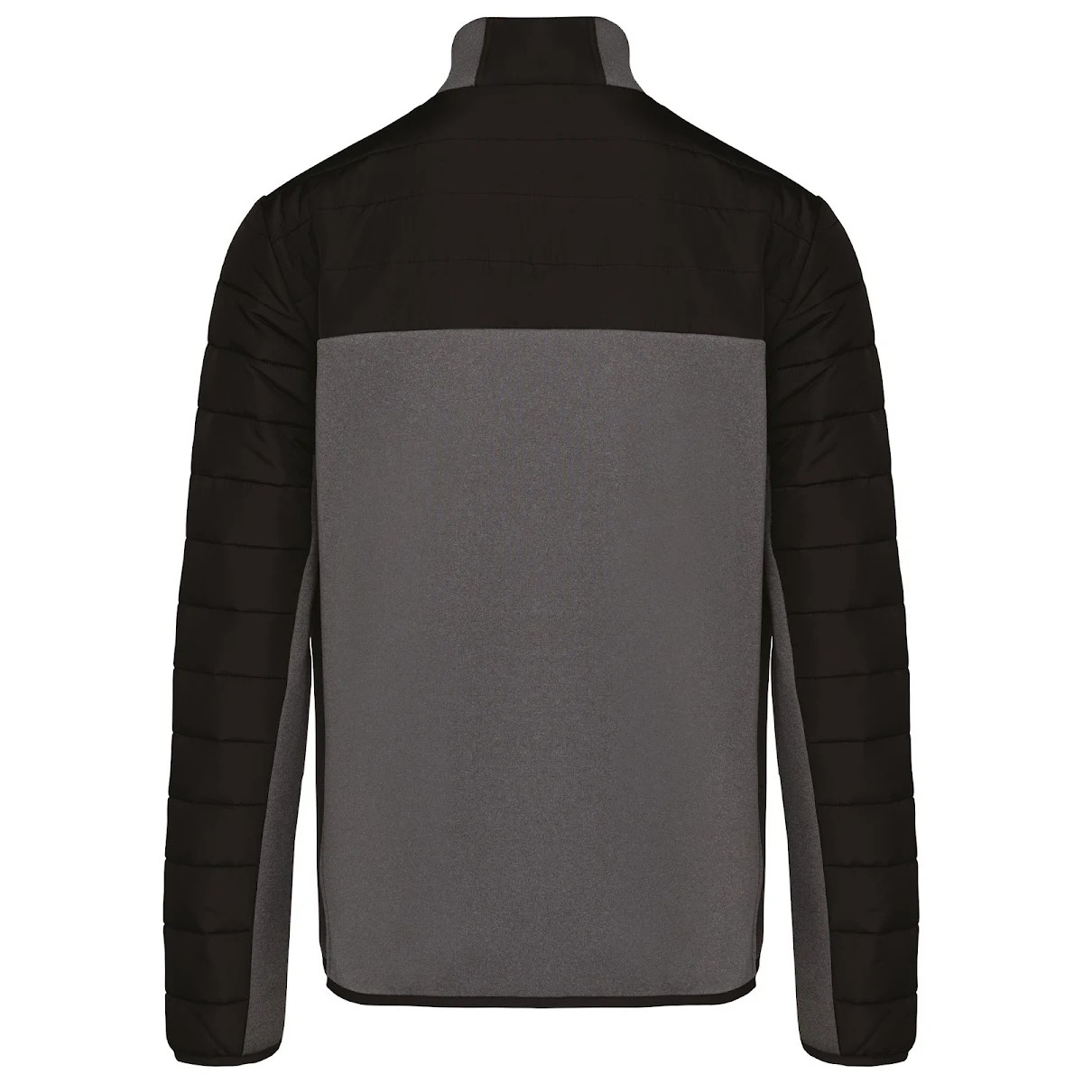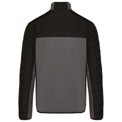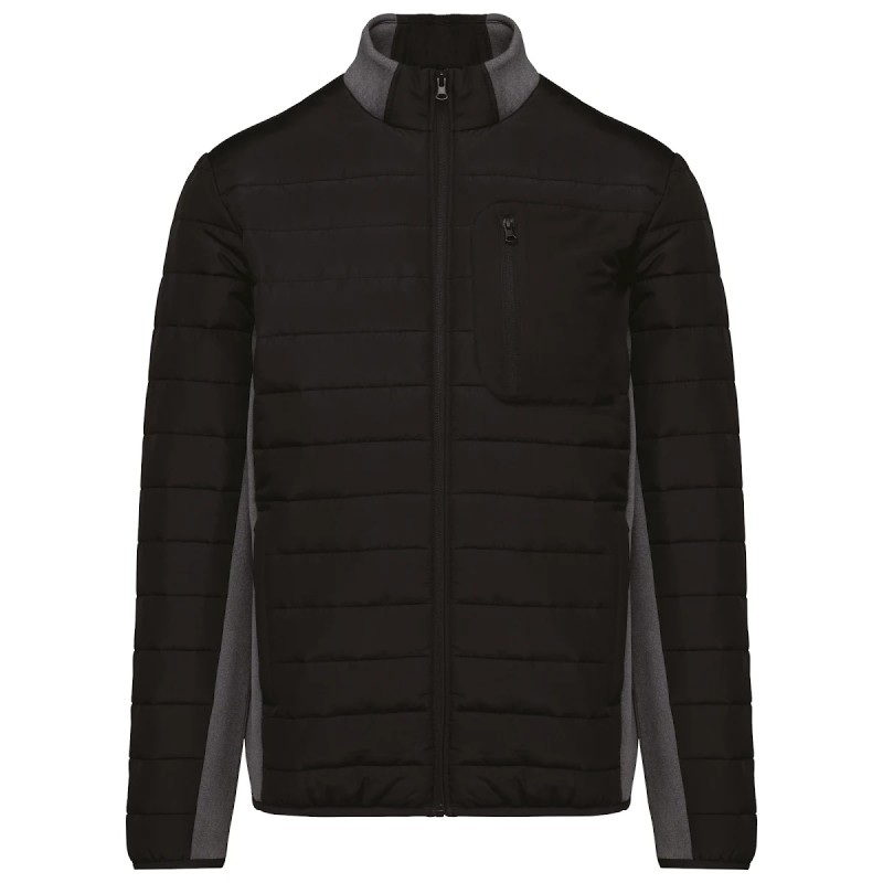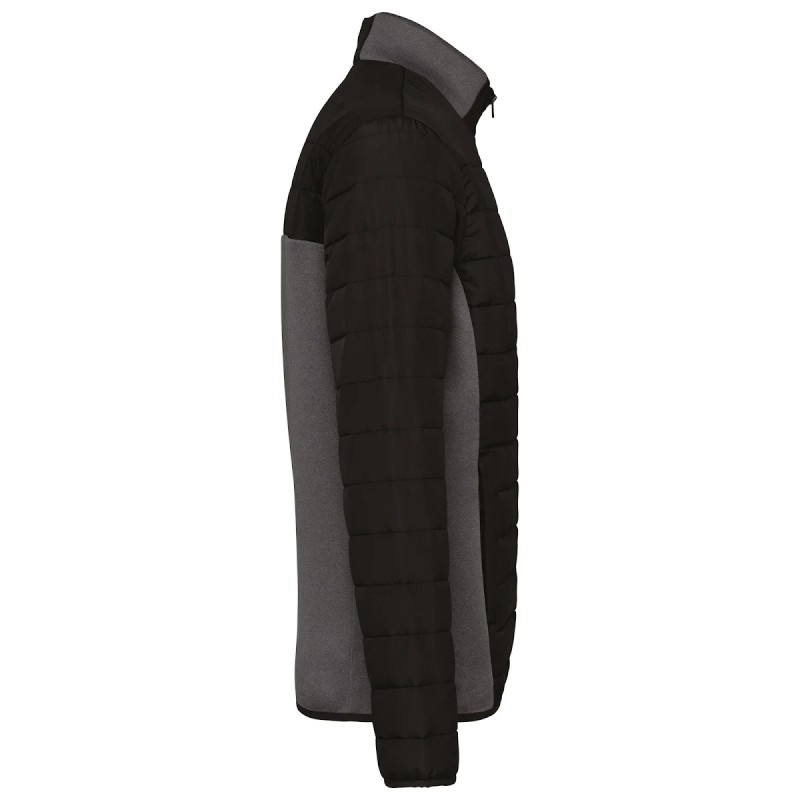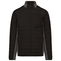 Tissu côtés, dos, dessous manches et partie du col : 94% polyester / 6% élasthanne. Tissu dessus manches, devant et dos : 100% polyester pongé 300T avec enduction polyuréthane. Rembourrage 100% polyester 120g. Doublure 100% polyester recyclé taffetas 230T. Partie corps avant et tiers dos matelassée. Fermeture devant avec zip nylon inversé. 2 poches côtés et passepoilées devant. Poche plaquée poitrine côté cœur fermée avec zip inversé. Col avec empiècements bi-matière. Biais de finition élastiqué aux bas de manches et bas de vêtement.