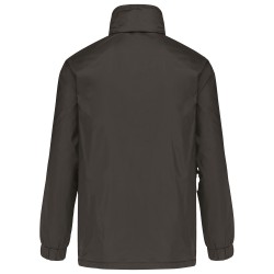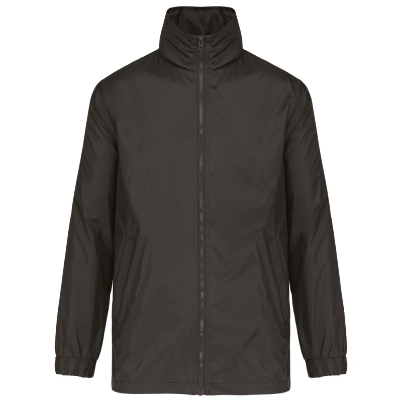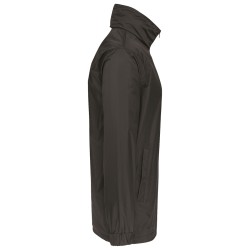 100% polyamide 210 T avec enduction acrylique. Fermeture zippée. 1 poche intérieure + 2 poches devant. Cordon élastique au bas du vêtement avec stoppeurs. Capuche dans le col avec cordon élastique. Doublure jersey gris chiné 100% polyester. Zip intérieur pour personnalisation.