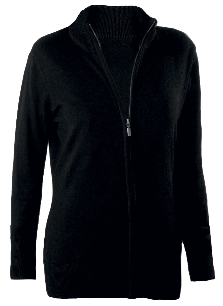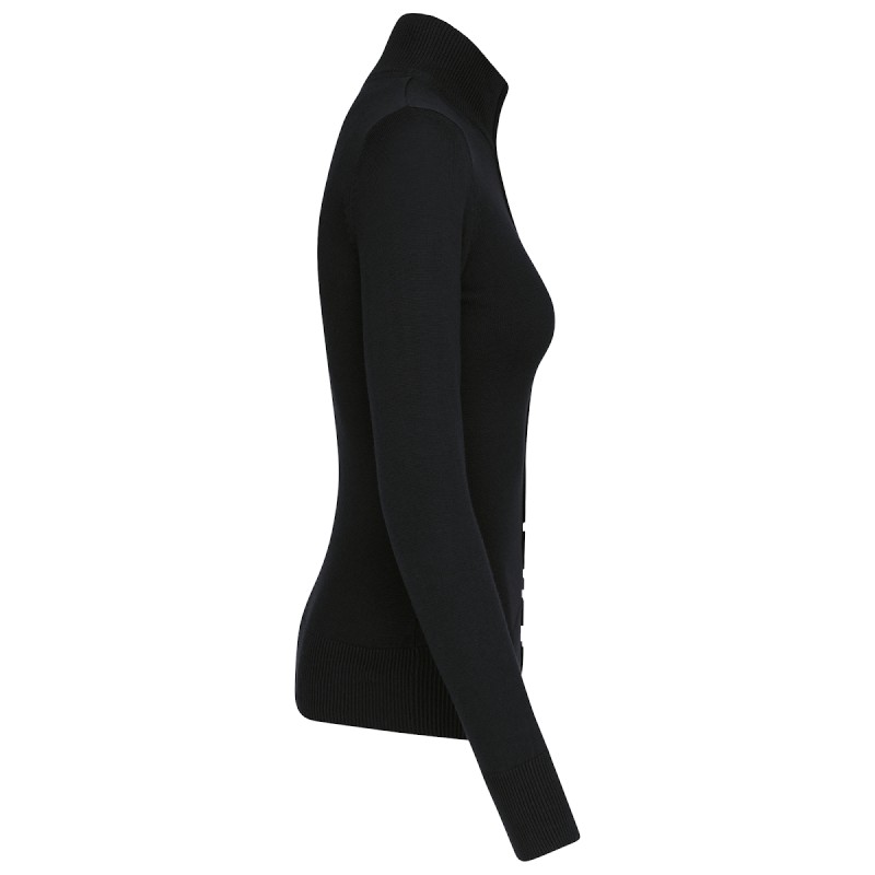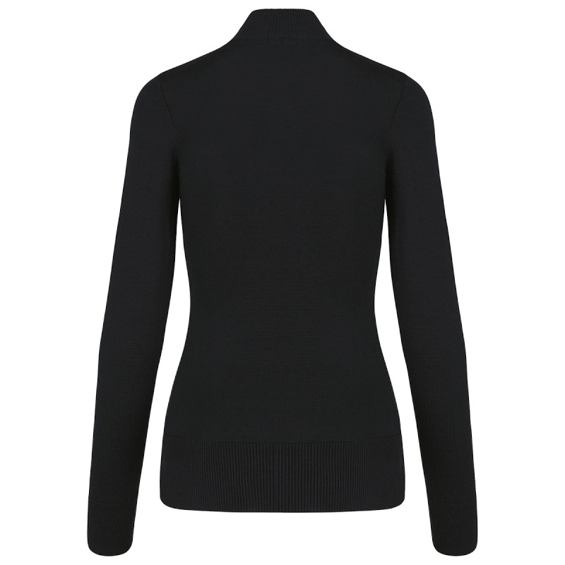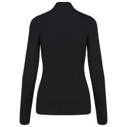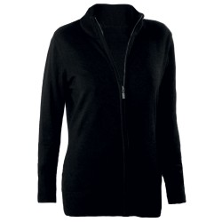50% coton / 50% acrylique (jauge 12). Coupe cintrée. Col cheminée double épaisseur et fermeture avec zip métal fumé. Bande de propreté à l'encolure.