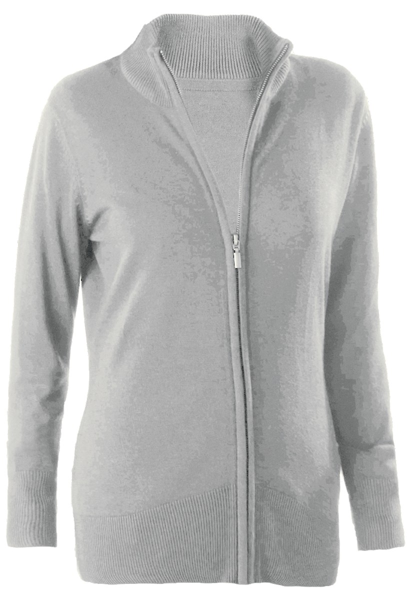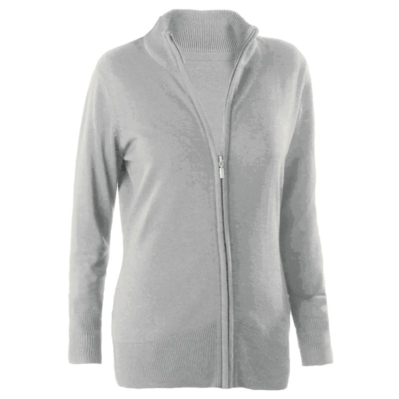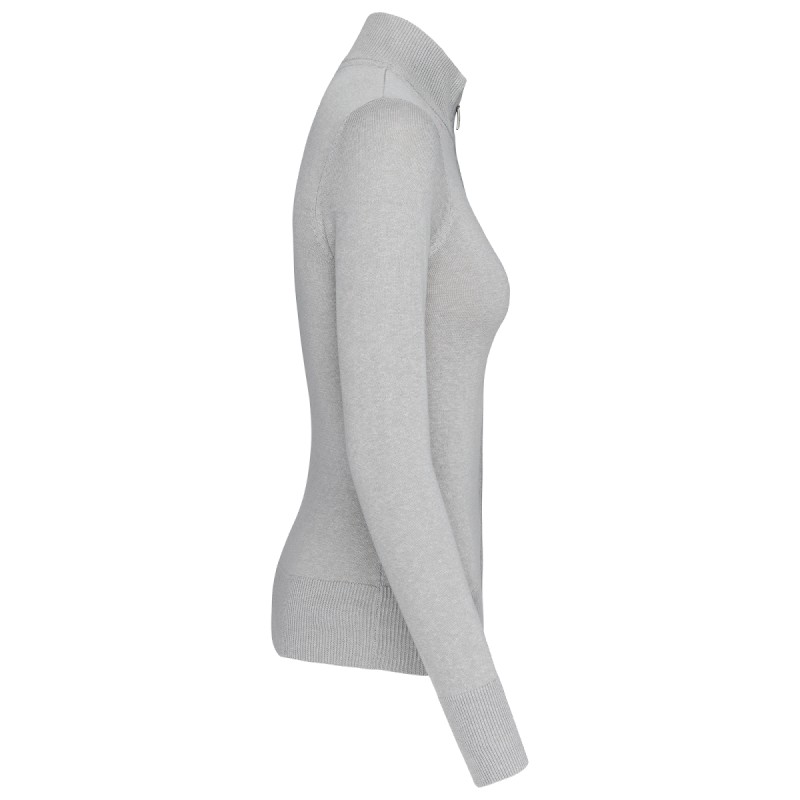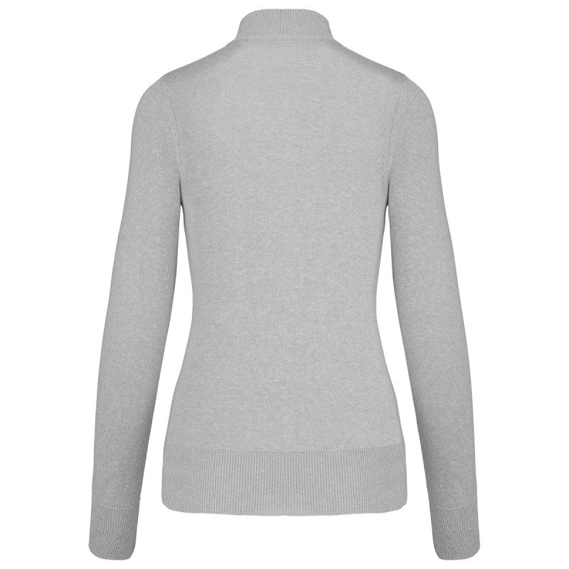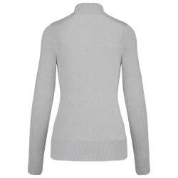 50% coton / 50% acrylique (jauge 12). Coupe cintrée. Col cheminée double épaisseur et fermeture avec zip métal fumé. Bande de propreté à l'encolure.