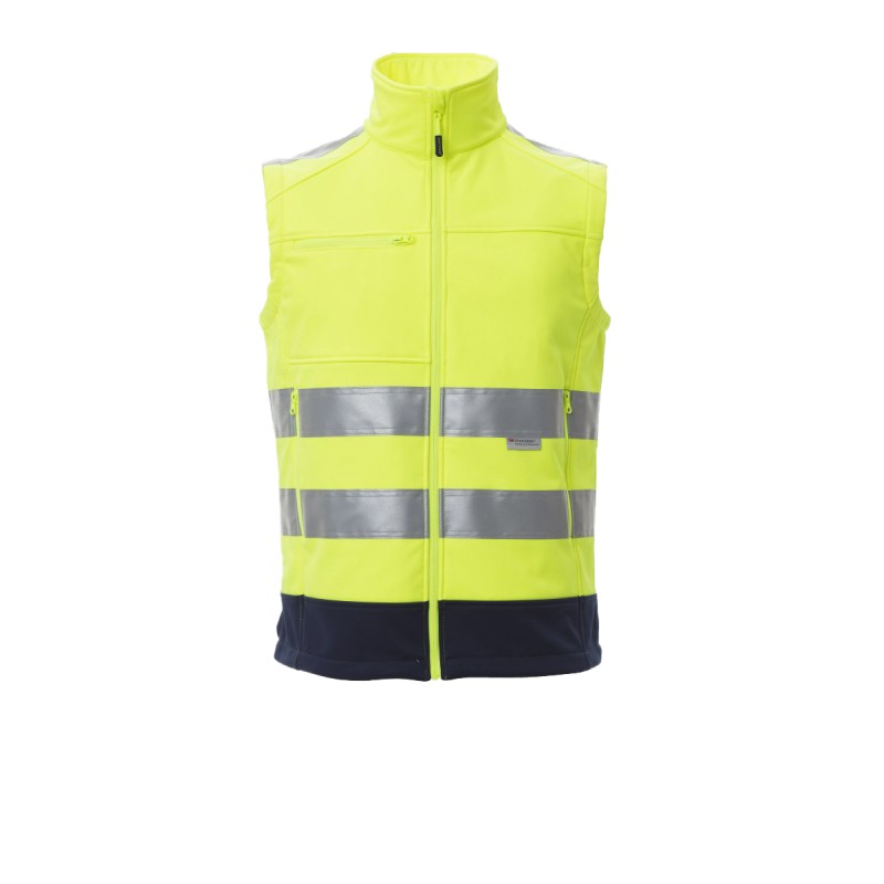 WP 8000 mm H₂O, WVT 5000 g/m² 24h. Gilet homme, coupe ergonomique bicolore haute visibilité à bandes 3M, fermeture éclair longue SBS à ruban, deux poches latérales avec zip, une poche poitrine avec porte-badge détachable et refermable.