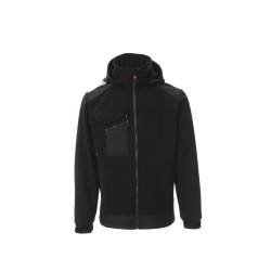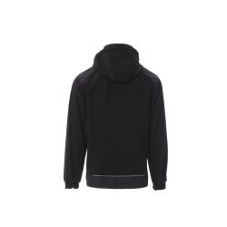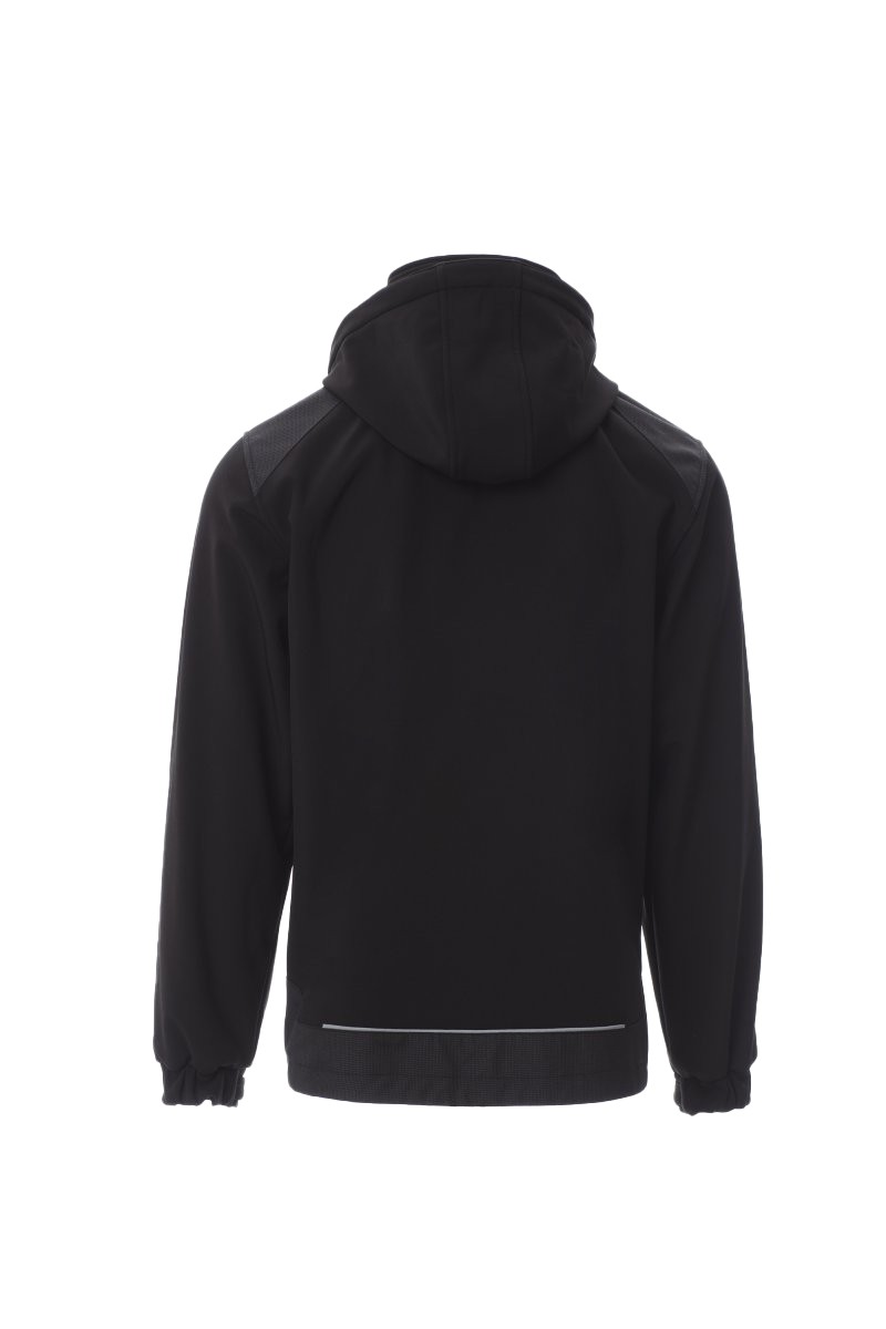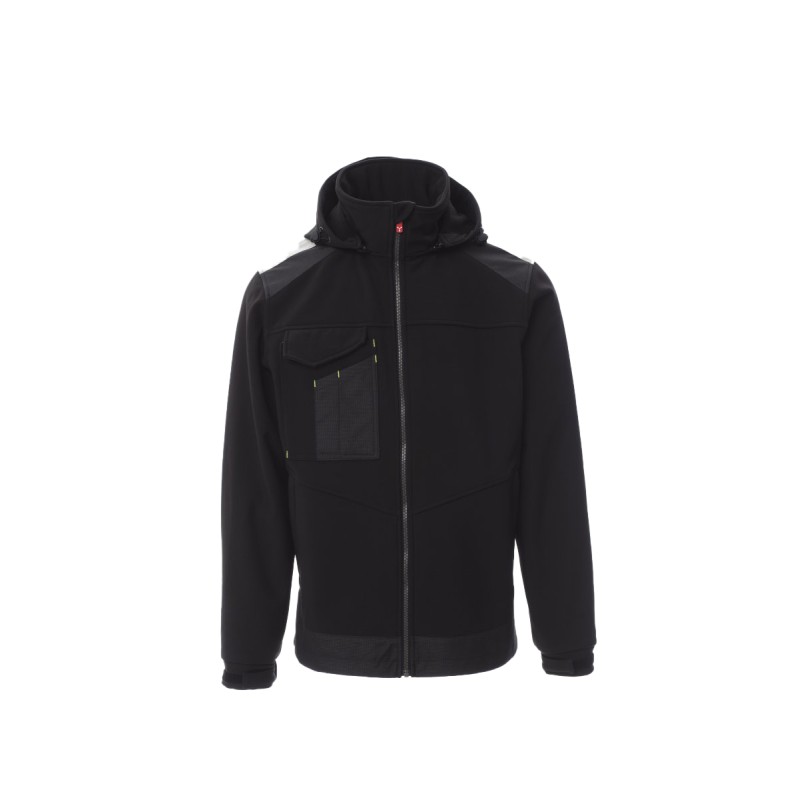 WP 8000 mm H₂O, WVT 5000 g/m² 24h. Veste pour homme coupe ergonomique, manches montées, zip intégral SBS en plastique avec curseur en métal à verrouillage semi-automatique, deux poches latérales avec fermeture éclair, une poche poitrine multifonction avec porte-badge escamotable et rabat de fermeture LOCK SYSTEM, bandes réfléchissantes 3M aux épaules, élastique et serre-poignet en velcro, capuche amovible avec coulisse en élastique réglable avec stoppeur.