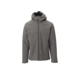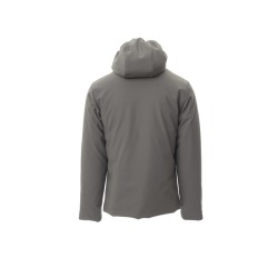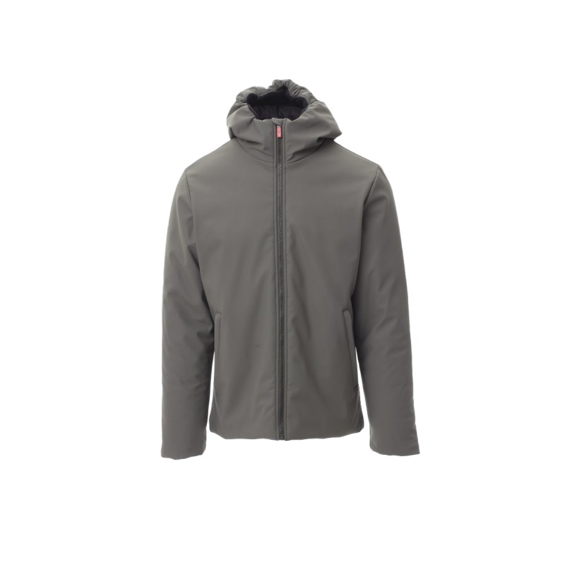 WP 8000 mm H₂O, WVT 3000 g/m² 24h. Veste soft-shell rembourrée pour homme, avec capuche, zip intégral SBS en plastique avec curseur en métal « semi-autolock », deux poches extérieures avec zip, une poche intérieure avec zip.