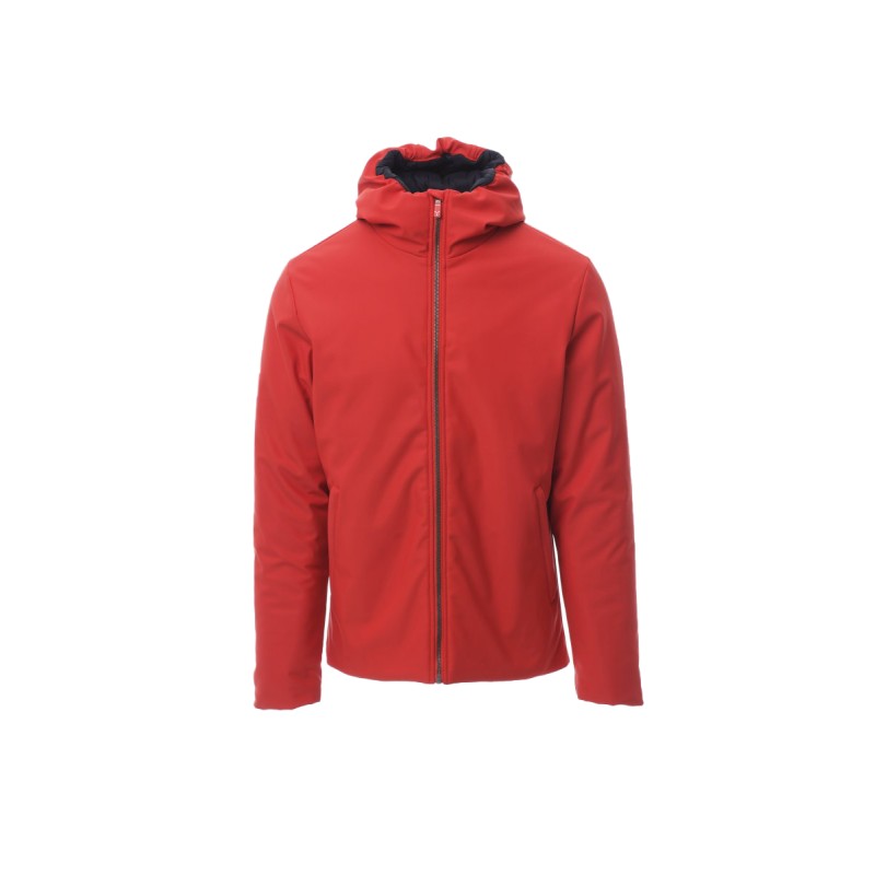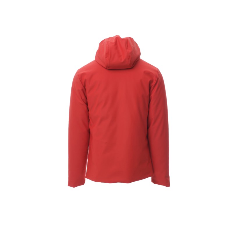 WP 8000 mm H₂O, WVT 3000 g/m² 24h. Veste soft-shell rembourrée pour homme, avec capuche, zip intégral SBS en plastique avec curseur en métal « semi-autolock », deux poches extérieures avec zip, une poche intérieure avec zip.