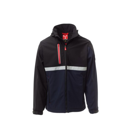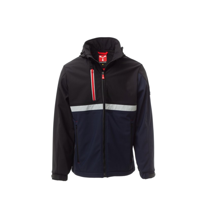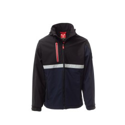 WP 8000 mm H₂O, WVT 5000 g/m² 24h. Soft-shell pour homme, fermeture par zip SBS avec curseur en métal à verrouillage semi-automatique et tirette personnalisée. Capuche amovible, avec coulisse réglable. Bande rétroréfléchissante frontale sur le torse. Poignets élastiques, réglables par velcro. Deux poches latérales avec zip et une poche poitrine fermée par zip avec détail rétroréfléchissant. Élément « life-saving » au dos, avec logo interne rétroréfléchissant, fermé par zip. Une poche intérieure porte-tablette, fermée par velcro. Doublure intérieure respirante sur le dos. Bas réglable avec stoppeurs personnalisés.