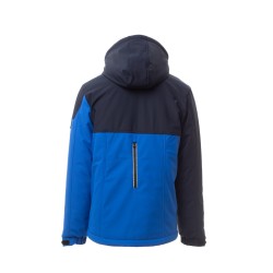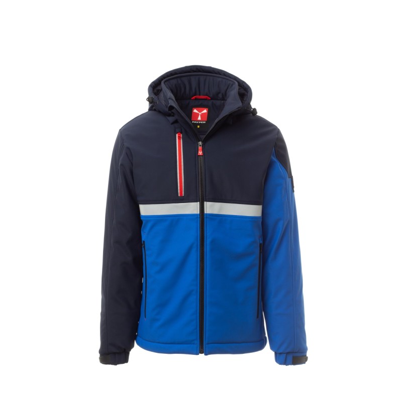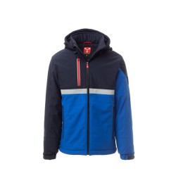 WP 8000 mm H₂O, WVT 5000 g/m² 24h. Soft-shell rembourré pour homme, fermeture par zip SBS avec curseur en métal à verrouillage semi-automatique et tirette personnalisée. Capuche amovible, avec coulisse réglable. Bande rétroréfléchissante frontale sur le torse. Poignets élastiques, réglables par velcro et poignet intérieur. Deux poches latérales avec zip et une poche poitrine fermée par zip avec détail rétroréfléchissant. Élément « life-saving » au dos, avec logo interne rétroréfléchissant, fermé par zip. Deux poches intérieures : une poche poitrine profilée avec zip côté droit et une poche porte-tablette fermée par velcro. Bas réglable avec stoppeurs personnalisés.
