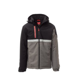 WP 8000 mm H₂O, WVT 5000 g/m² 24h. Soft-shell rembourré pour homme, fermeture par zip SBS avec curseur en métal à verrouillage semi-automatique et tirette personnalisée. Capuche amovible, avec coulisse réglable. Bande rétroréfléchissante frontale sur le torse. Poignets élastiques, réglables par velcro et poignet intérieur. Deux poches latérales avec zip et une poche poitrine fermée par zip avec détail rétroréfléchissant. Élément « life-saving » au dos, avec logo interne rétroréfléchissant, fermé par zip. Deux poches intérieures : une poche poitrine profilée avec zip côté droit et une poche porte-tablette fermée par velcro. Bas réglable avec stoppeurs personnalisés.