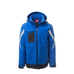 WP 8000 mm H₂O, WVT 5000 g/m² 24h. Soft-shell rembourré pour homme, fermeture par zip SBS avec curseur en métal à verrouillage semi-automatique et tirette personnalisée. Capuche amovible, avec coulisse réglable. Bande rétroréfléchissante sur les épaules et les bras. Poignets élastiques, réglables par velcro et poignet intérieur. Poche poitrine Lock System avec rabat, porte-badge et porte-stylos. Deux poches latérales fermées par zip avec ruban enduit. Élément « life-saving » au dos, avec logo interne rétroréfléchissant, fermé par zip enduit. Deux poches intérieures dont une avec porte-tablette fermée par velcro et une profilée avec zip sur poitrine côté droit. Bas réglable avec stoppeurs personnalisés. Tissu alvéolé avec effet rétroréfléchissant.