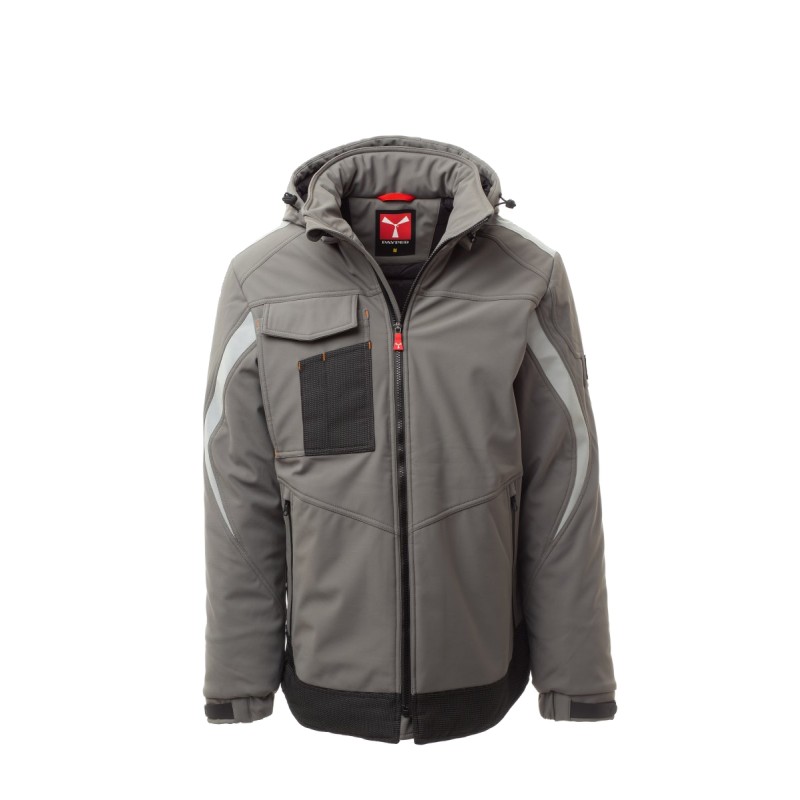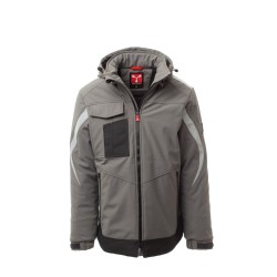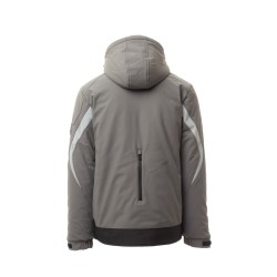 WP 8000 mm H₂O, WVT 5000 g/m² 24h. Soft-shell rembourré pour homme, fermeture par zip SBS avec curseur en métal à verrouillage semi-automatique et tirette personnalisée. Capuche amovible, avec coulisse réglable. Bande rétroréfléchissante sur les épaules et les bras. Poignets élastiques, réglables par velcro et poignet intérieur. Poche poitrine Lock System avec rabat, porte-badge et porte-stylos. Deux poches latérales fermées par zip avec ruban enduit. Élément « life-saving » au dos, avec logo interne rétroréfléchissant, fermé par zip enduit. Deux poches intérieures dont une avec porte-tablette fermée par velcro et une profilée avec zip sur poitrine côté droit. Bas réglable avec stoppeurs personnalisés. Tissu alvéolé avec effet rétroréfléchissant.