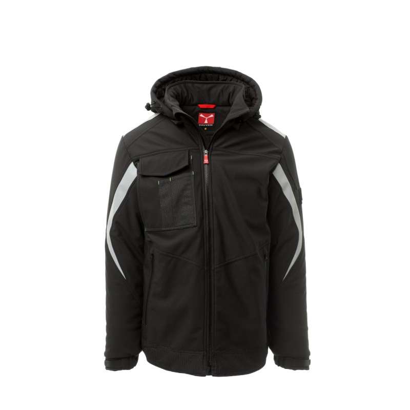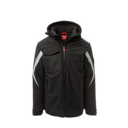 WP 8000 mm H₂O, WVT 5000 g/m² 24h. Soft-shell rembourré pour homme, fermeture par zip SBS avec curseur en métal à verrouillage semi-automatique et tirette personnalisée. Capuche amovible, avec coulisse réglable. Bande rétroréfléchissante sur les épaules et les bras. Poignets élastiques, réglables par velcro et poignet intérieur. Poche poitrine Lock System avec rabat, porte-badge et porte-stylos. Deux poches latérales fermées par zip avec ruban enduit. Élément « life-saving » au dos, avec logo interne rétroréfléchissant, fermé par zip enduit. Deux poches intérieures dont une avec porte-tablette fermée par velcro et une profilée avec zip sur poitrine côté droit. Bas réglable avec stoppeurs personnalisés. Tissu alvéolé avec effet rétroréfléchissant.