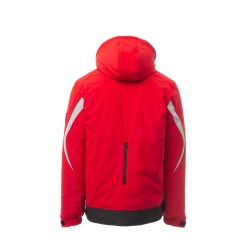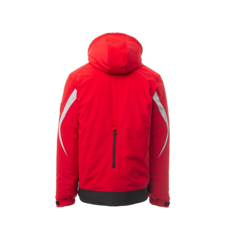 WP 8000 mm H₂O, WVT 5000 g/m² 24h. Soft-shell rembourré pour homme, fermeture par zip SBS avec curseur en métal à verrouillage semi-automatique et tirette personnalisée. Capuche amovible, avec coulisse réglable. Bande rétroréfléchissante sur les épaules et les bras. Poignets élastiques, réglables par velcro et poignet intérieur. Poche poitrine Lock System avec rabat, porte-badge et porte-stylos. Deux poches latérales fermées par zip avec ruban enduit. Élément « life-saving » au dos, avec logo interne rétroréfléchissant, fermé par zip enduit. Deux poches intérieures dont une avec porte-tablette fermée par velcro et une profilée avec zip sur poitrine côté droit. Bas réglable avec stoppeurs personnalisés. Tissu alvéolé avec effet rétroréfléchissant.