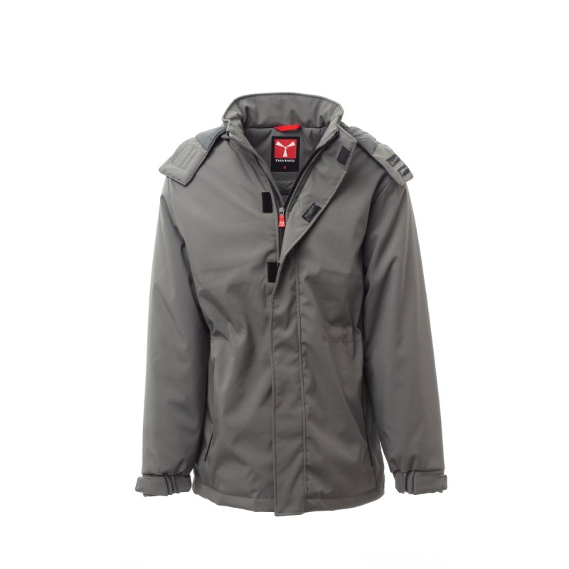 WP 8000 mm H₂O, WVT 5000 g/m² 24h. Soft-shell rembourré pour homme, avec fermeture en velcro et zip avec curseur en métal à verrouillage semi-automatique et tirette personnalisée. Capuche amovible et pouvant être fermée sur le devant par velcro. Coulisse à la taille, deux poches extérieures avec zip enduit, une poche intérieure passepoilée avec fermeture par velcro, une poche intérieure porte-tablette avec fermeture par velcro. Poignets élastiques, réglables par velcro. Patch personnalisé au dos du col, avec détail rétroréfléchissant.