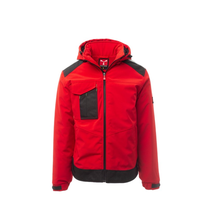 WP 8000 mm H₂O, WVT 5000 g/m² 24h Soft-shell rembourré pour homme, fermeture par zip avec curseur en métal à verrouillage semi-automatique et tirette personnalisée. Capuche amovible, avec coulisse réglable. Bande rétroréfléchissante sur les épaules. Poignets élastiques, réglables par velcro. Poche poitrine Lock System avec rabat et porte-stylos. Deux poches latérales fermées par zip. Deux poches intérieures dont une avec porte-tablette fermée par velcro et une profilée avec zip sur poitrine côté droit. Bas réglable avec stoppeurs personnalisés et passepoil réfléchissant sur le dos.