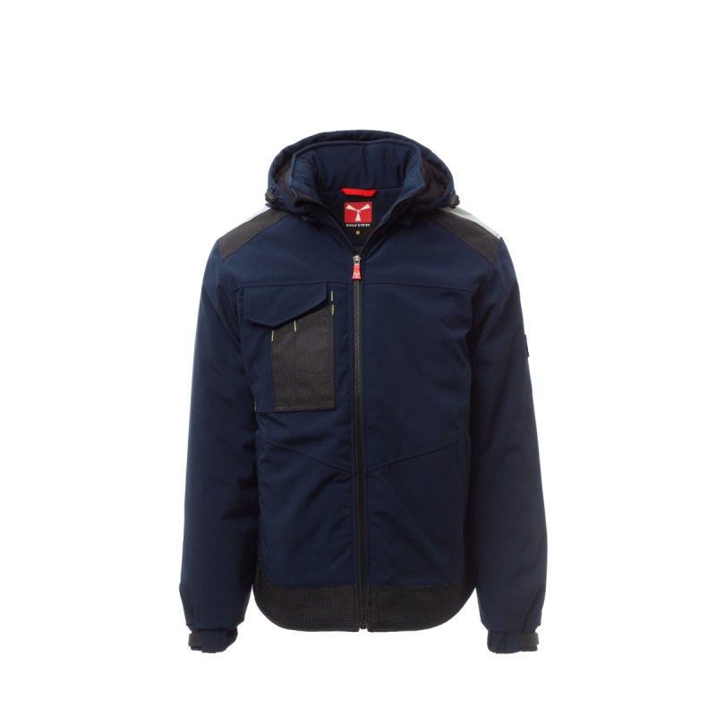 WP 8000 mm H₂O, WVT 5000 g/m² 24h Soft-shell rembourré pour homme, fermeture par zip avec curseur en métal à verrouillage semi-automatique et tirette personnalisée. Capuche amovible, avec coulisse réglable. Bande rétroréfléchissante sur les épaules. Poignets élastiques, réglables par velcro. Poche poitrine Lock System avec rabat et porte-stylos. Deux poches latérales fermées par zip. Deux poches intérieures dont une avec porte-tablette fermée par velcro et une profilée avec zip sur poitrine côté droit. Bas réglable avec stoppeurs personnalisés et passepoil réfléchissant sur le dos.