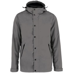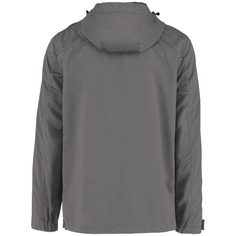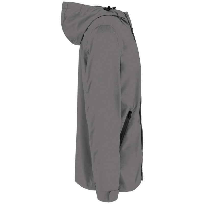 87% polyester (32% recyclé) / 13% polyamide. Boutons pression electrostatic paint et métal. Tissu déperlant. Zips en plastique et puller en métal. Poches latérales côtés à zips retournés (waterproof). Capuche panneaux, doublée en polyamide ripstop quadrillé. Bande auto-agrippante aux bas de manches + demi-élastique. Doublure intérieure en ripstop volante au dos pour faciliter la personnalisation. Finition biais à l'emmanchure, côtés vêtement et intérieur de manches. Œillets d'aération dos sous les manches. Élastique bas de vêtement, cordon de serrage avec stopper sur les côtés. Patte de boutonnage avec boutons pressions sur le milieu devant.
