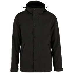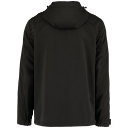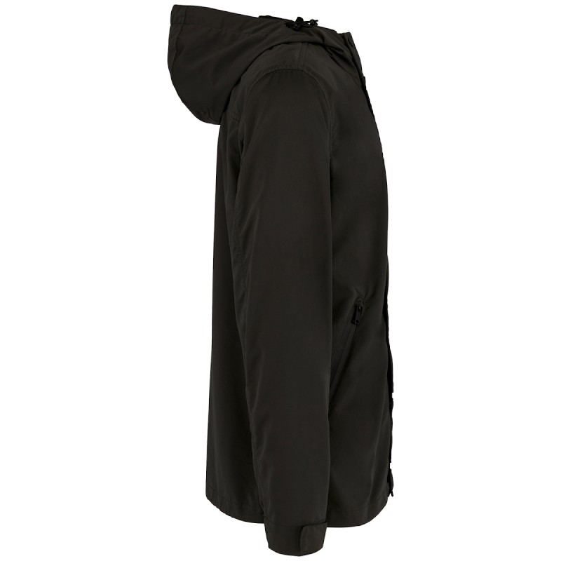 87% polyester (32% recyclé) / 13% polyamide. Boutons pression electrostatic paint et métal. Tissu déperlant. Zips en plastique et puller en métal. Poches latérales côtés à zips retournés (waterproof). Capuche panneaux, doublée en polyamide ripstop quadrillé. Bande auto-agrippante aux bas de manches + demi-élastique. Doublure intérieure en ripstop volante au dos pour faciliter la personnalisation. Finition biais à l'emmanchure, côtés vêtement et intérieur de manches. Œillets d'aération dos sous les manches. Élastique bas de vêtement, cordon de serrage avec stopper sur les côtés. Patte de boutonnage avec boutons pressions sur le milieu devant.