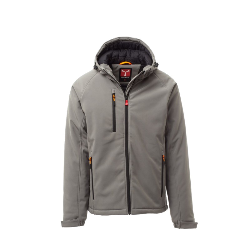 WP 8000 mm H₂O, WVT 5000 g/m² 24h. Soft-shell rembourré pour homme, fermeture par zip avec curseur en métal à verrouillage semi-automatique et tirette personnalisée. Capuche fixe avec coulisse réglable. Poignets élastiques, réglables par velcro. Deux poches latérales et une poche poitrine, fermées par zip. Tirettes fluorescentes. Deux poches intérieures : une poche profilée avec zip et une poche porte-tablette fermée par velcro. Bas réglable avec stoppeurs personnalisés.