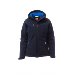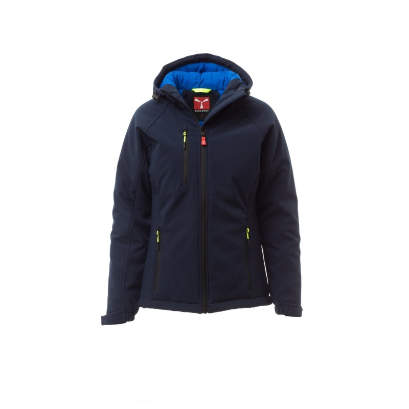 WP 8000 mm H₂O, WVT 5000 g/m² 24h. Soft-shell rembourré pour femme, fermeture par zip avec curseur en métal à verrouillage semi-automatique et tirette personnalisée. Capuche fixe avec coulisse réglable. Poignets élastiques, réglables par velcro. Deux poches latérales et une poche poitrine, fermées par zip. Tirettes fluorescentes. Deux poches intérieures : une poche profilée avec zip et une poche porte-tablette fermée par velcro. Bas réglable avec stoppeurs personnalisés.