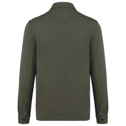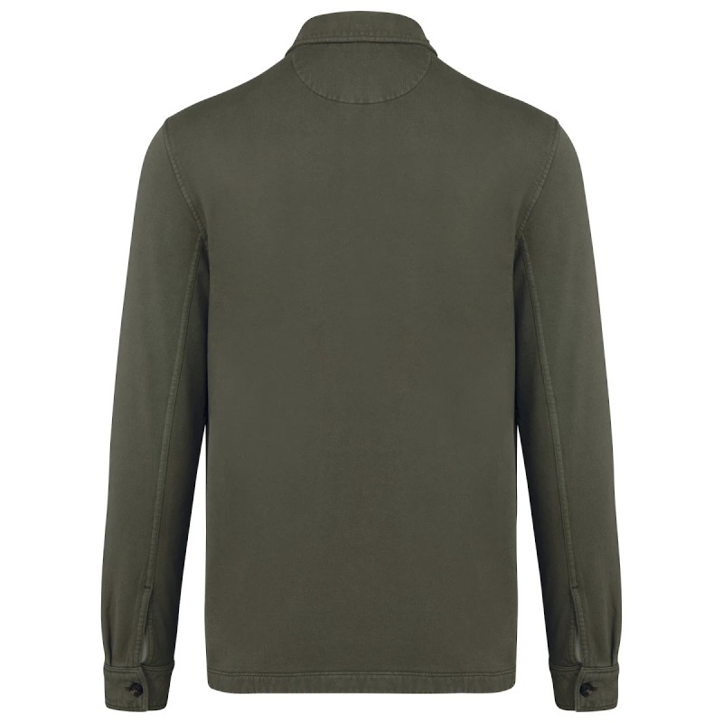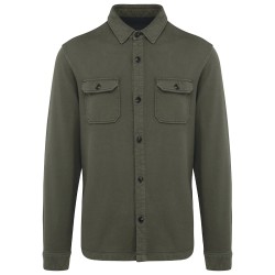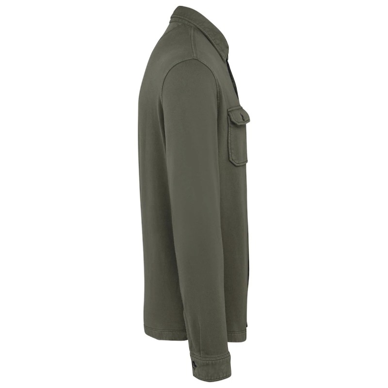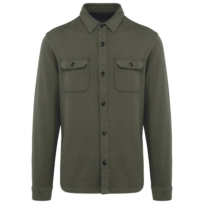 100% coton biologique. Coupe droite. Maille. Molleton gratté 3 fils. Aspect délavé. Patte de boutonnage avec boutons contrastés effet corne en plastique recyclé. Poignet boutonnée avec fente. Col avec pied de col. Finition encolure bande de propreté en chevrons ton sur ton. Deux poches plaquées avec rabat et bouton. Ourlet double surpiqûre bas de vêtement. Demi-lune au dos. Vêtement teint en pièce après montage : les couleurs peuvent légèrement varier d'un produit à un autre. Ce produit est susceptible de déteindre au contact avec des surfaces ou vêtements clairs.