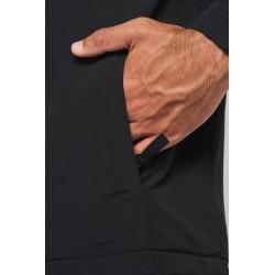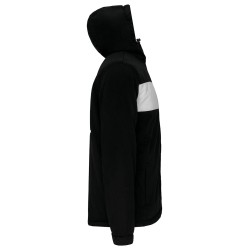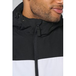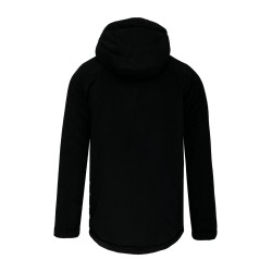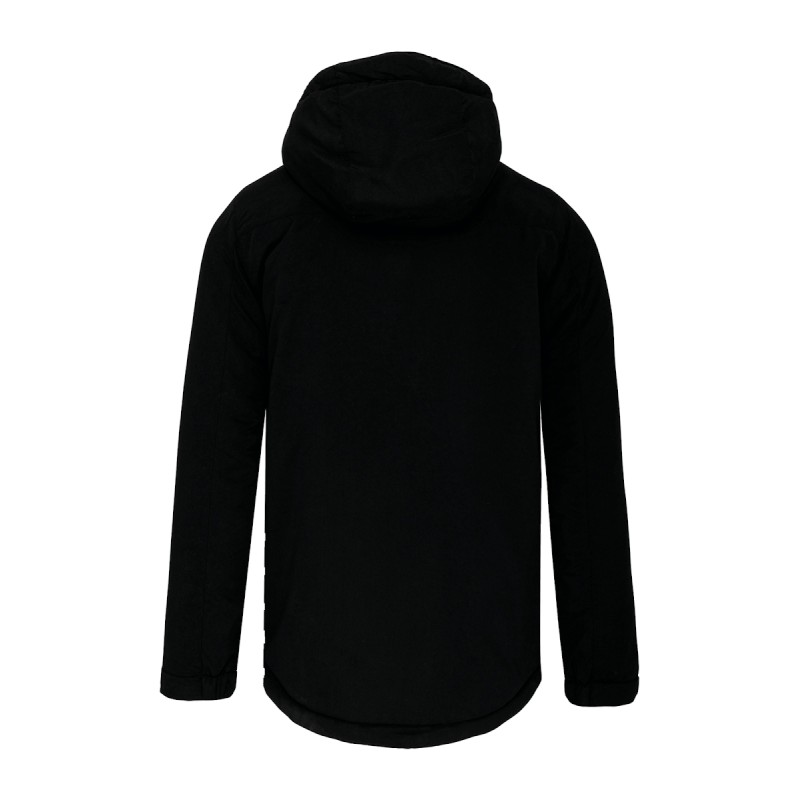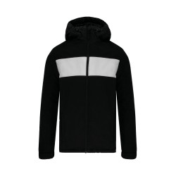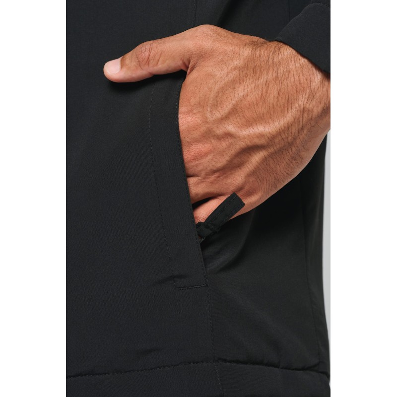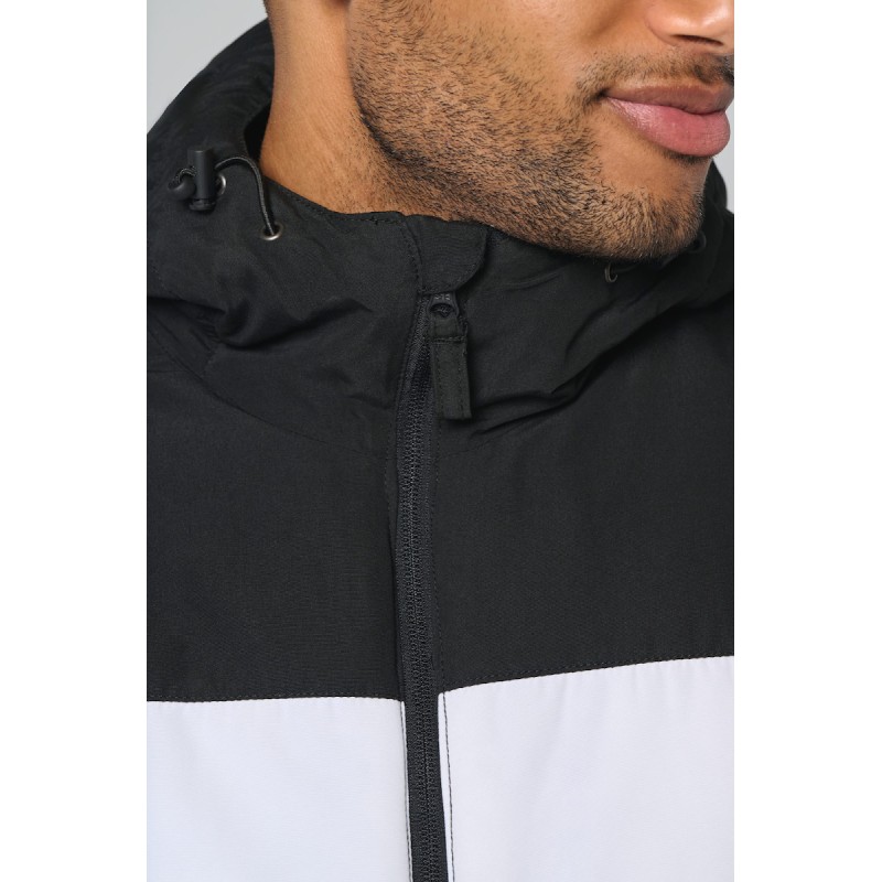 100% polyester. Extérieur : 100% polyester avec traitement déperlant et toucher peau de pêche. Doublure 100% polyester taffetas. Ouatinage 100% polyester. Fermeture zippée. 2 poches zippées côtés cachées et 1 poche intérieure plaquée. Bande contrastée devant. Capuche en 3 parties matelassée avec stoppeurs. 1 étiquette pour noter son nom à l'intérieur côté droit niveau poitrine. Bas de manches semi-élastiqué. 1 zip côté cœur et 1 zip au bas du vêtement pour accès personnalisation.