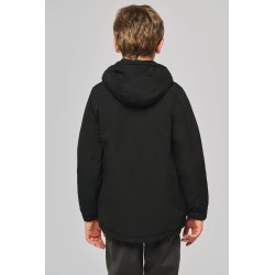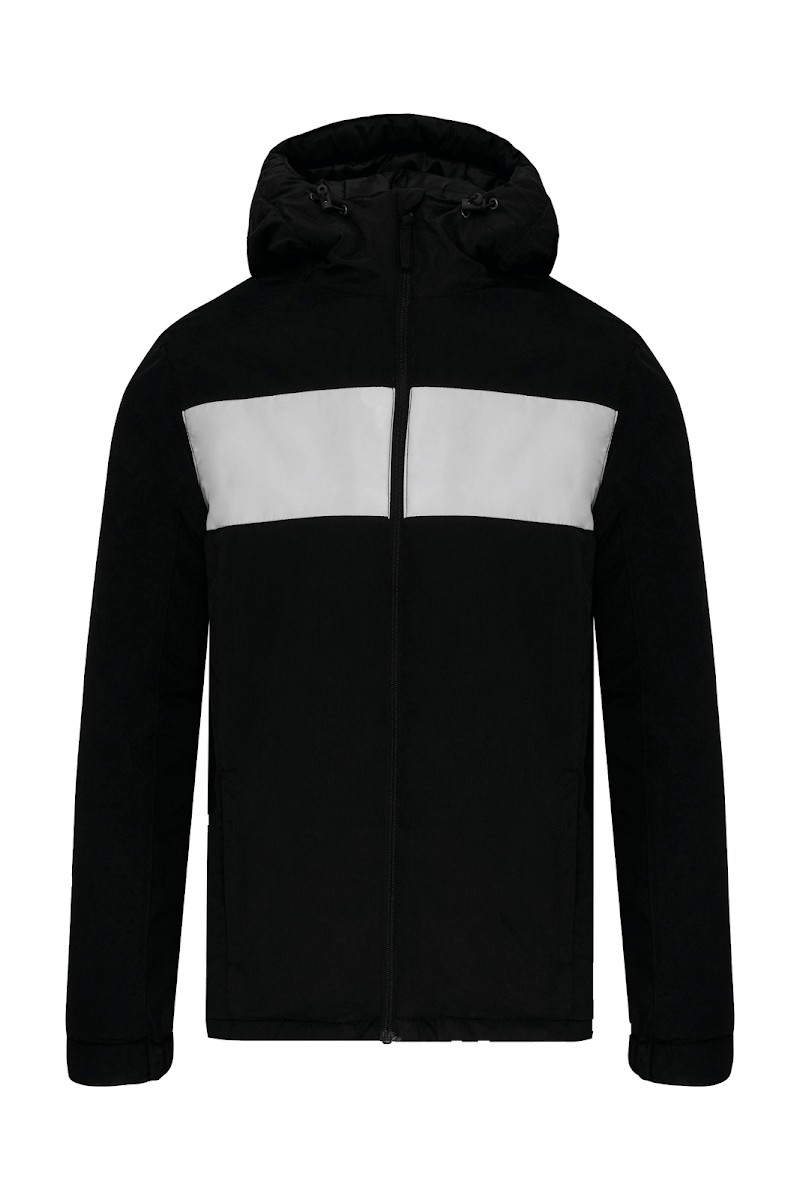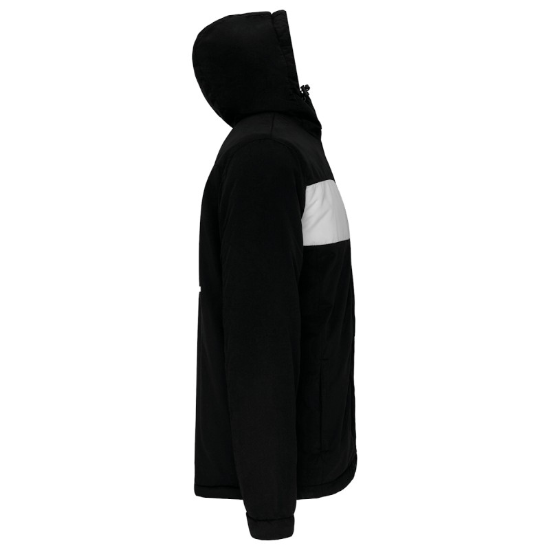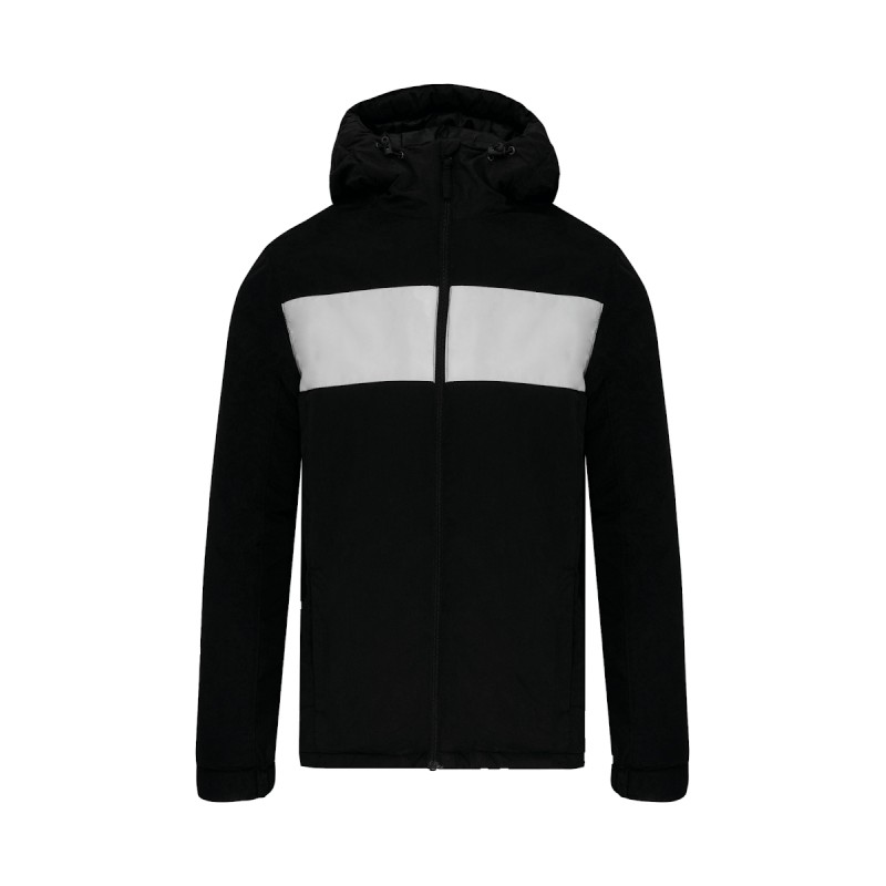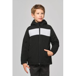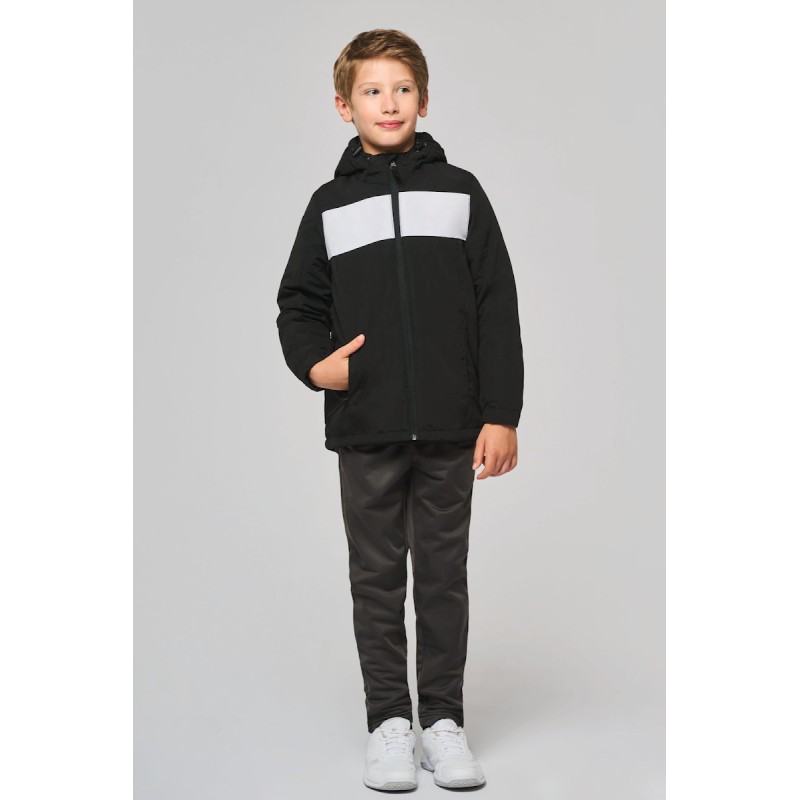100% polyester. Extérieur : 100% polyester avec traitement déperlant et toucher peau de pêche. Doublure 100% polyester taffetas. Ouatinage 100% polyester. Fermeture zippée. 2 poches zippées côtés et 1 poche intérieure. Bande contrastée devant. Capuche en 3 parties matelassée avec stoppeurs. 1 étiquette pour noter son nom à l'intérieur côté droit niveau poitrine. 1 zip côté cœur et 1 zip au bas du vêtement pour accès personnalisation.