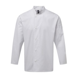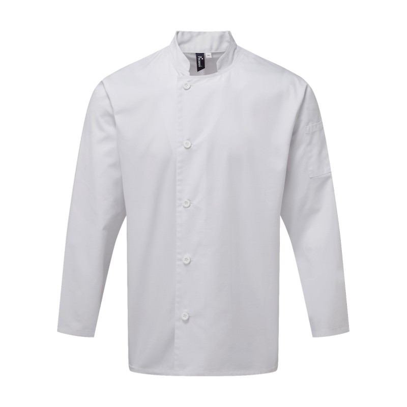 Veste de cuisine à manches longues en tissu résistant qui se ferme sur le côté droit à cinq boutons en résine durable. Double poche à stylo très utile sur la manche gauche. Cette veste à col Mao est disponible en noir et blanc et constitue un excellent rapport qualité-prix.