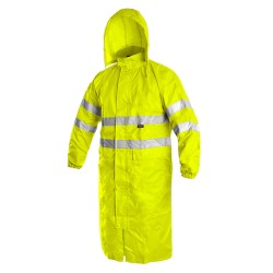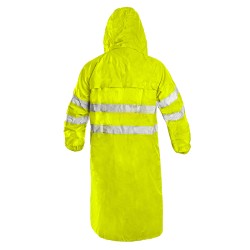 Surveste de pluie haute visibilité Homme Bandes réfléchissantes Manches raglan Col montant avec capuche intégrée Capuche amovible avec cordon de serrage Fermeture zippée avec rabat boutons pression 2 poches latérales avec rabat Poignets élastiqués Aération sous les aisselles et au dos Coupe-vent et étanche 100% polyester Tissage Oxford Poids : 105 gr/m² Lavable à 40 °C Coutures étanches EN ISO 20471 (classe 3) et EN 343+A1 (imperméabilité : classe 3 et respirabilité : classe 1) Haute performance contre les intempéries Rangement pratique sous pochette individuelle