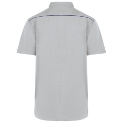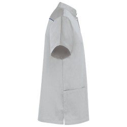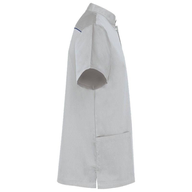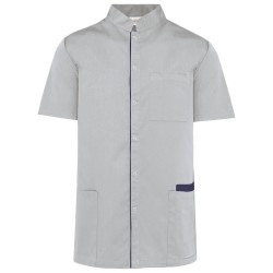 65% polyester / 35% coton. Tissu twill polycoton. Lavage à 60°C. Coupe ajustée. Col mao. Fermeture avant avec boutons pression. 1 poche poitrine plaquée côté cœur avec compartiment stylo. 2 grandes poches plaquées avant dont une (à gauche) à double compartiments (poche intérieure à bord contrasté). Passepoil contrasté sur la patte de fermeture et sur l'empiècement dos. 2 fentes d'aisance latérales. Etiquette nom à l'intérieur du vêtement. Etiquette de marque Tear-away.