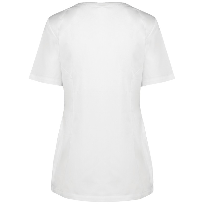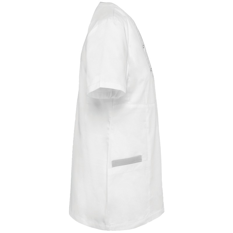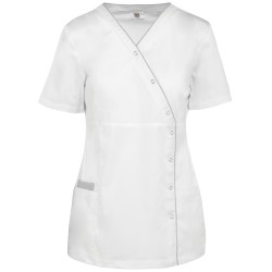 65% polyester / 35% coton. Tissu twill polycoton. Lavage à 60°C. Coupe ajustée grâce à des pinces devant et dos pour une coupe plus féminine. Encolure en V, Fermeture asymétrique par bouton-pression. 2 poches avant dont une (à droite) à double compartiments (poche intérieure à bord contrasté). Passepoil contrasté à l'encolure et le long de la patte de fermeture. Etiquette nom à l'intérieur du vêtement. Etiquette de marque Tear Away.
