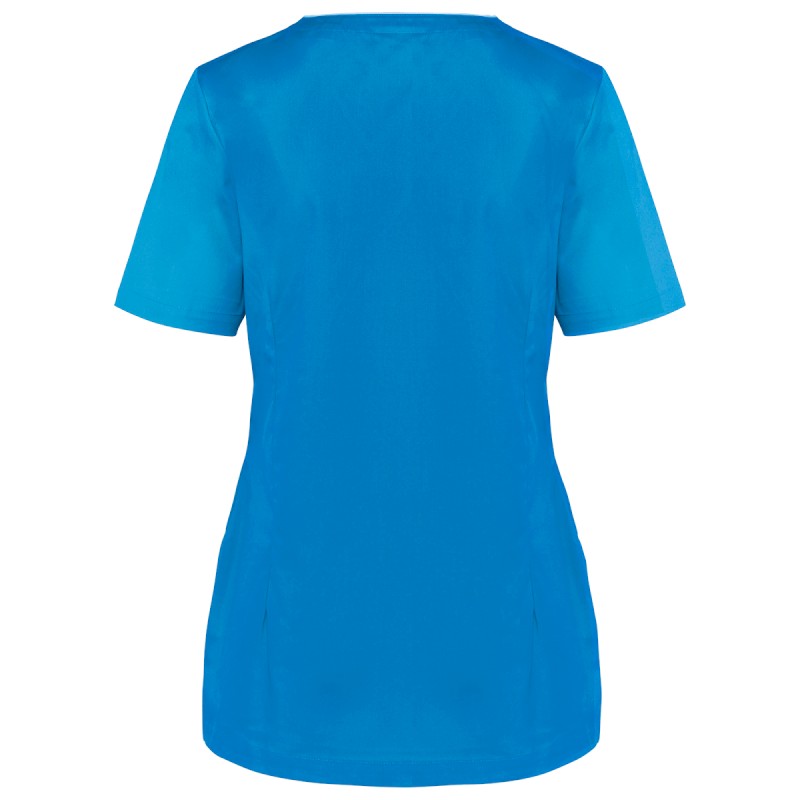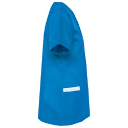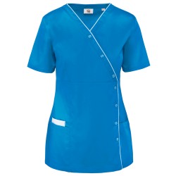 65% polyester / 35% coton. Tissu twill polycoton. Lavage à 60°C. Coupe ajustée grâce à des pinces devant et dos pour une coupe plus féminine. Encolure en V, Fermeture asymétrique par bouton-pression. 2 poches avant dont une (à droite) à double compartiments (poche intérieure à bord contrasté). Passepoil contrasté à l'encolure et le long de la patte de fermeture. Etiquette nom à l'intérieur du vêtement. Etiquette de marque Tear Away.