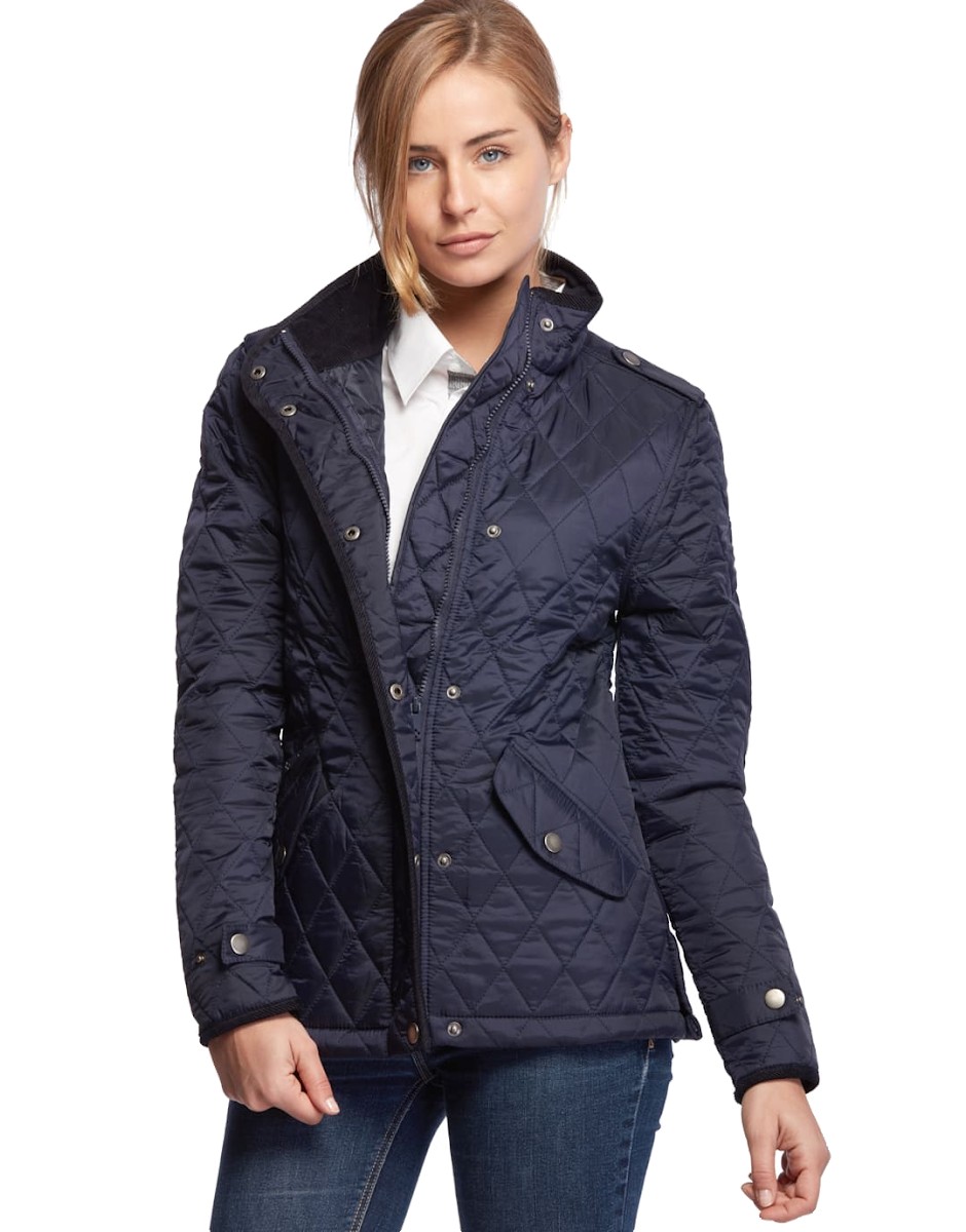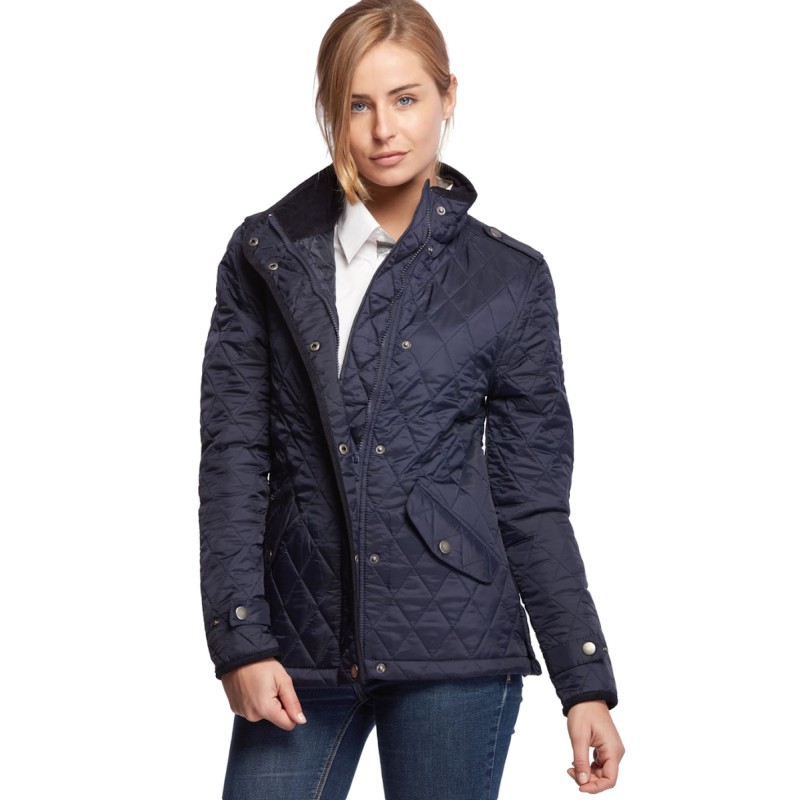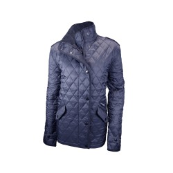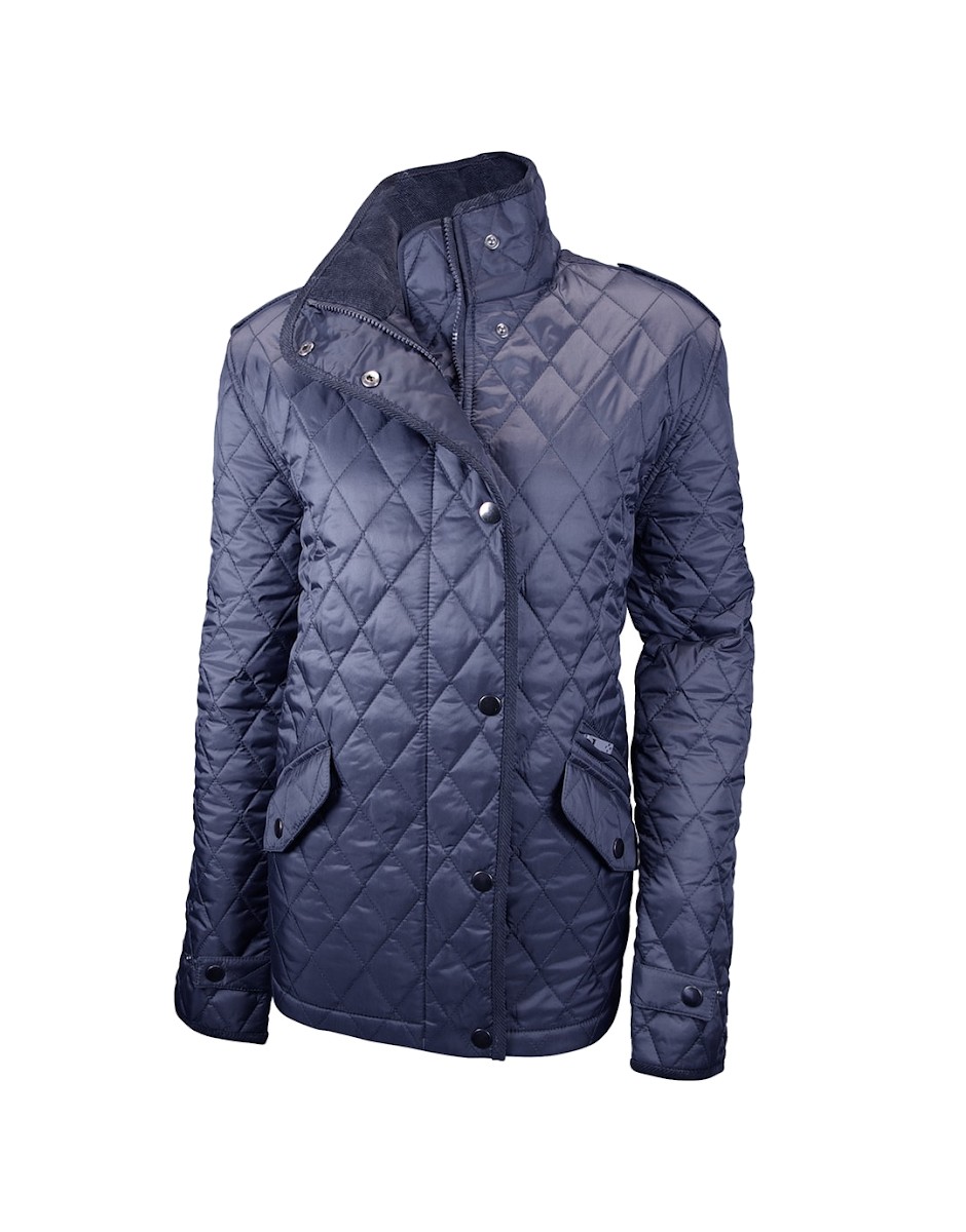 Blouson matelassé diamant femme. Col et biais velours. Face externe en nylon, garnissage ouatine de polyester, doublure polyester, 2 poches avec rabat, 1 poche zippée. 2 poches intérieures. Doublure col velours. Serrage poignet par pression. Ouverture d'aisance sur les côtés. Disponible sur stock et livré sous 24/48h sans personnalisation, coloris disponibles : Anthracite, Marine dans les tailles S, M, L, XL
