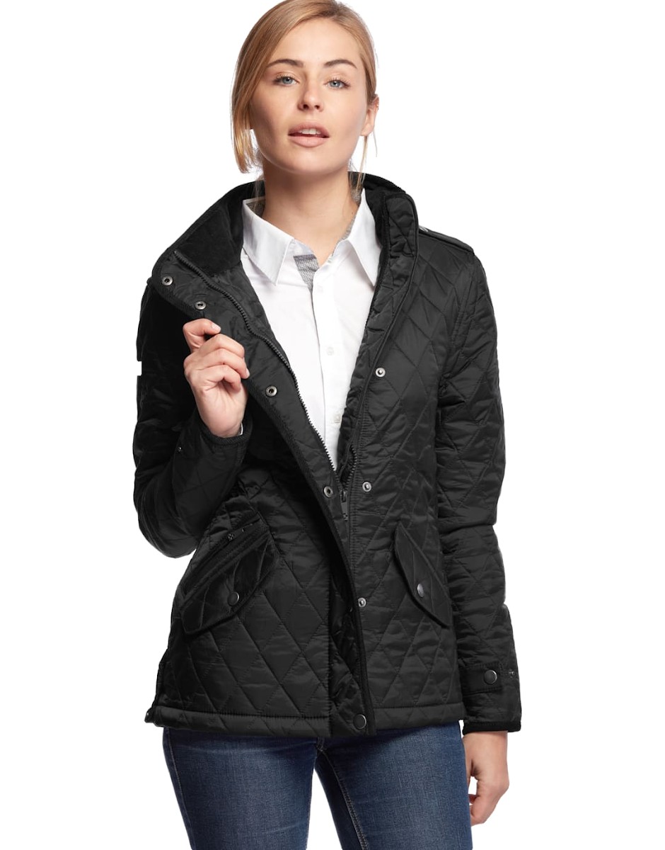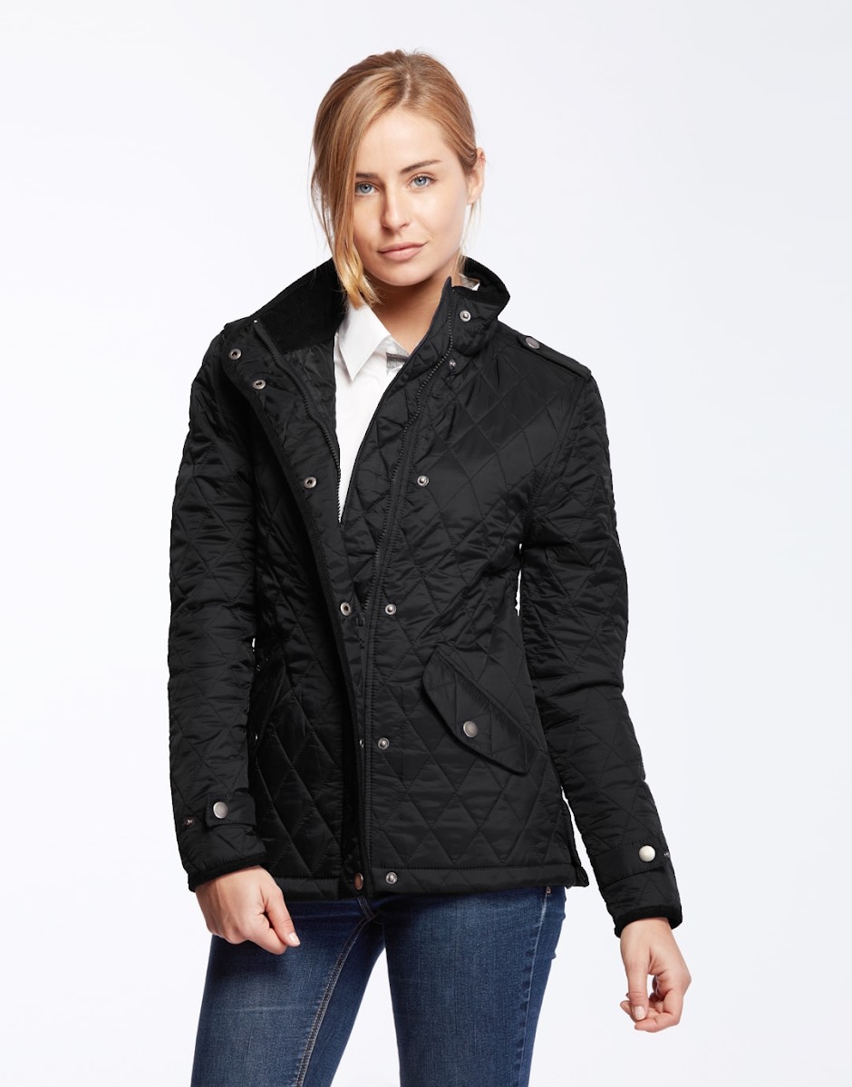 Blouson matelassé diamant femme. Col et biais velours. Face externe en nylon, garnissage ouatine de polyester, doublure polyester, 2 poches avec rabat, 1 poche zippée. 2 poches intérieures. Doublure col velours. Serrage poignet par pression. Ouverture d'aisance sur les côtés. Disponible sur stock et livré sous 24/48h sans personnalisation, coloris disponibles : Anthracite, Marine dans les tailles S, M, L, XL