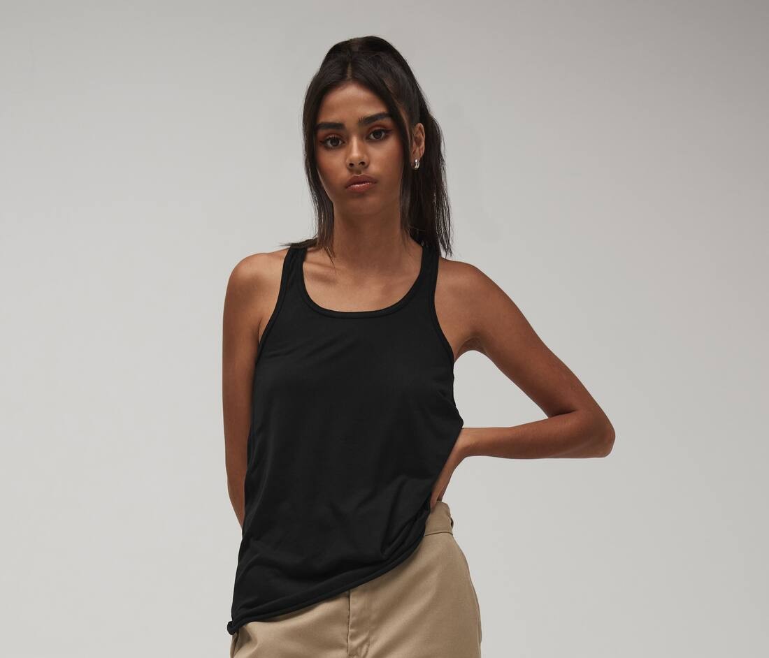 Coutures latérales. Coupe décontractée et flottante. Dos nageur avec coutures transparentes. Étiquette détachable.