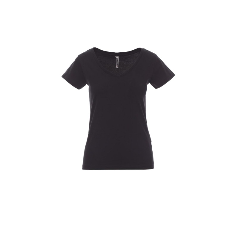 Tee-shirt pour femme, cintré, avec ample col en «V», bas mixte Spandex de 1.2 cm, manches étroites couture latérale pour une portabilité plus précise, coutures à deux aiguilles sur épaules et arrière du col et ruban en coton.