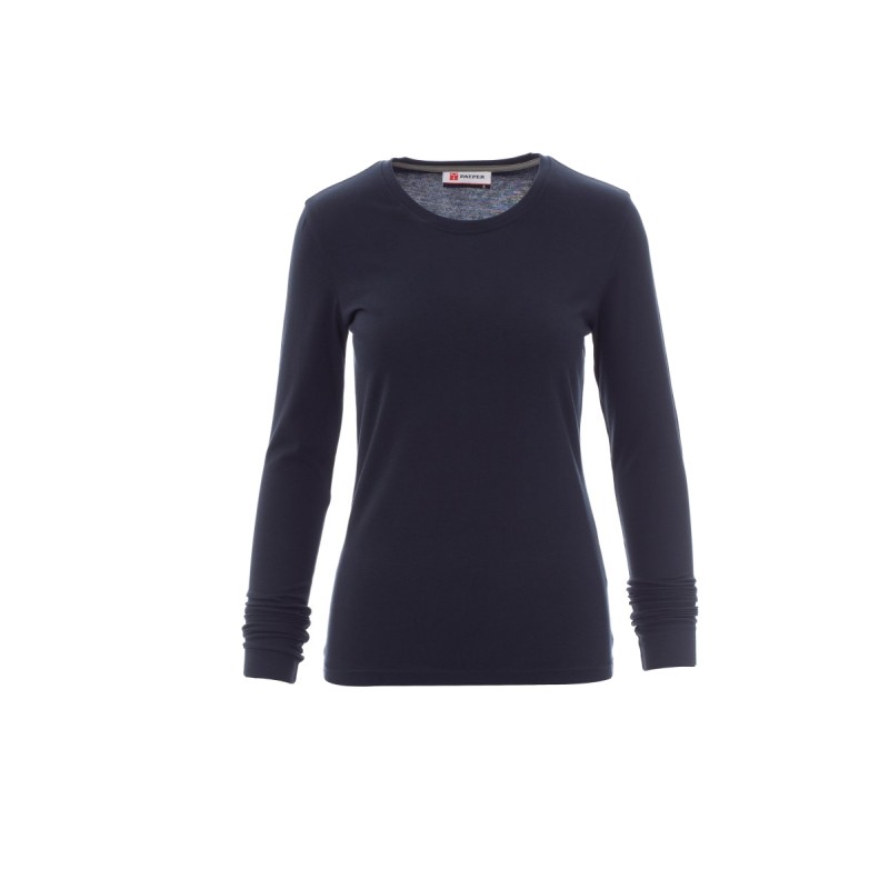 Tee-shirt cintré pour femme, encolure ras le cou et manches longues, col en bord côtes mixte spandex de 1,5 cm avec couture rabattue sur le devant, poignet long, ruban de renfort d'épaule à épaule dans couleur en contraste sur le col, coutures stretch, couture latérale