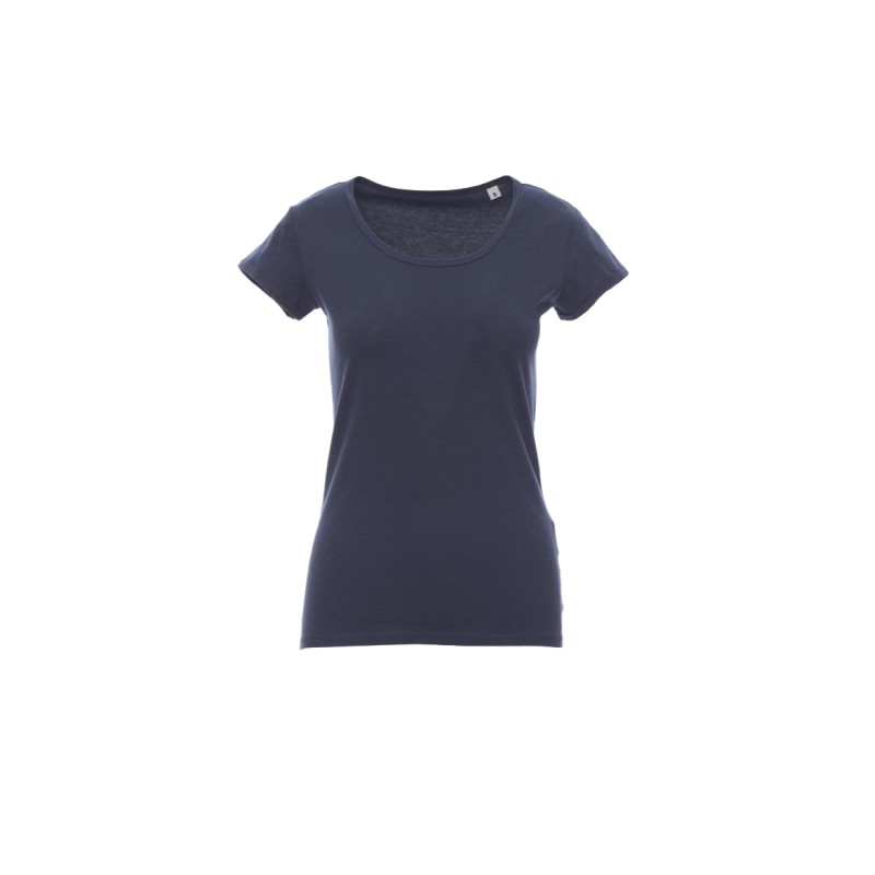 Tee-shirt cintré pour femme à manches courtes et encolure arrondie un peu ample, col avec fin liseré, finition des manches avec revers fin à bord vif, couture latérale